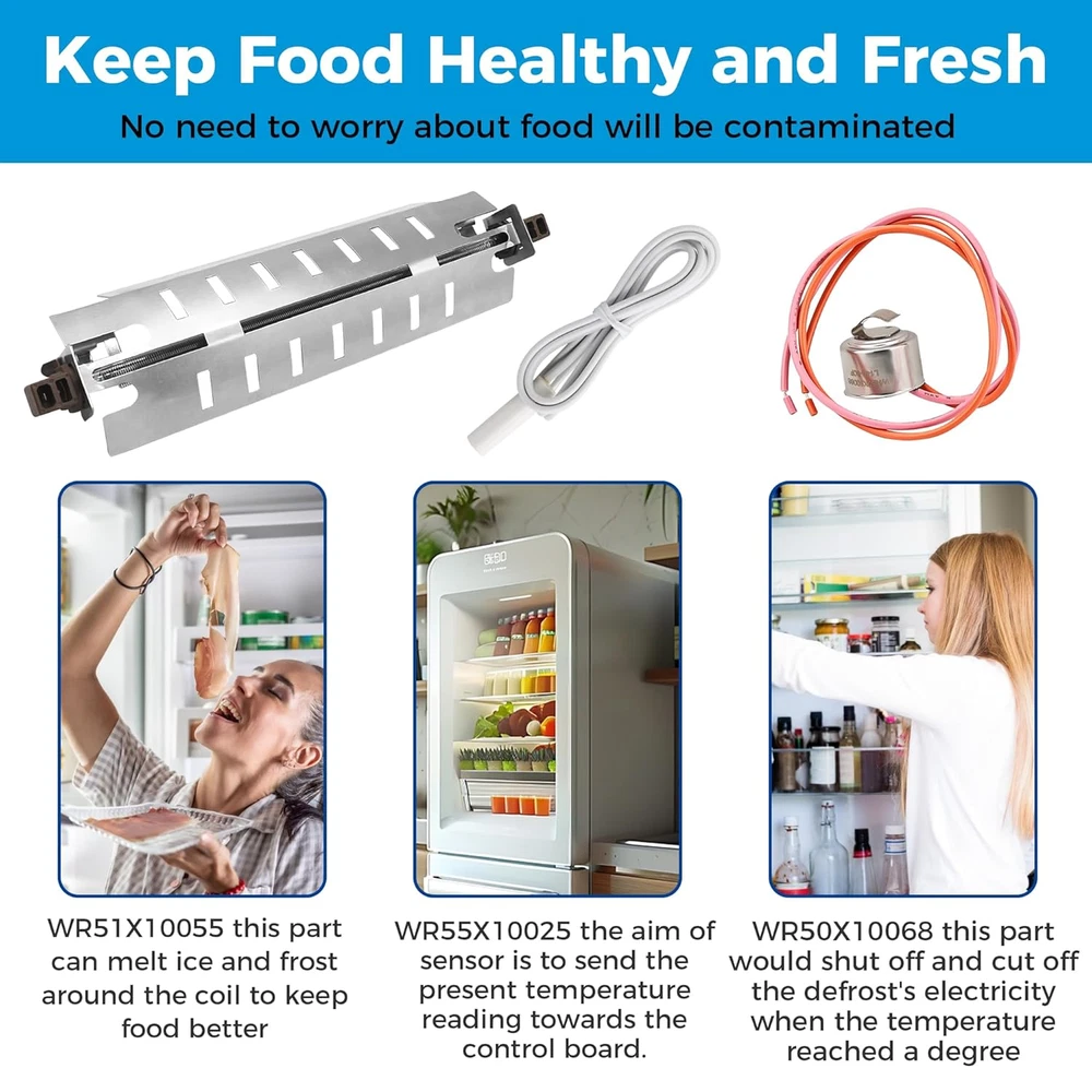 Store New Arrivals Add to Favorite View Feedback Contact "Defrost Heater, Sensor & Thermostat WR51X10055 WR55X10025 WR50X10068 Replacement Set" "Defrost Heater, Sensor & Thermostat WR51X10055 WR55X10025 WR50X10068 Replacement Set" Product Description Product Overview This complete set of defrost components includes the WR51X10055 Defrost Heater, WR55X10025 Temperature Sensor, and WR50X10068 Defrost Thermostat. All parts come in one carton box for convenience, and are designed to replace various compatible part numbers. These high-quality replacement parts ensure your appliance functions efficiently, helping maintain your food's freshness by preventing frost buildup. Easy to install, they offer a long-lasting solution for any refrigeration system. Key Features Complete Defrost Set : Includes the WR51X10055 Defrost Heater, WR55X10025 Temperature Sensor, and WR50X10068 Defrost Thermostat, ensuring a full replacement for your defrost system. Perfect Fit : The WR51X10055 Defrost Heater replaces part numbers WR51X10030, AP3183311, PS303781, 914088, AH303781, EA303781, and others. The WR55X10025 Temperature Sensor replaces multiple part numbers like 914093, AP3185407, and WR50X10027. The WR50X10068 Defrost Thermostat replaces WR50X10015, AP3884317, and many more. Keep Food Fresh & Healthy : The WR51X10055 Defrost Heater melts ice and frost around the coil, preventing buildup and keeping food at optimal storage conditions. The WR55X10025 Sensor reads and sends the current temperature to the control board. The WR50X10068 Thermostat cuts off power to the defrost when the ideal temperature is reached, ensuring safety. Durable & High-Quality : Made from durable materials and well-tested to meet OEM standards, ensuring long-lasting and effective performance for your appliance. Safety First : Always disconnect power before installation, and use work gloves to protect your hands during the process. Possible FAQs What appliances are these parts compatible with? These parts are designed to be used in compatible refrigeration units with specific model numbers, such as freezers and refrigerators. Please check compatibility before purchase. How do I install these parts? To install these parts, you must disconnect the appliance from the power source, remove the defective parts, and replace them with the new ones. Refer to the appliance manual or consult a professional technician for assistance. Are these parts OEM replacements? Yes, these parts are manufactured to meet or exceed OEM standards, ensuring reliable performance and compatibility with your appliance. Why do I need to replace the defrost heater, sensor, and thermostat? These parts are critical for maintaining the proper temperature in your appliance. Over time, they can wear out or fail, leading to frost buildup, which affects the efficiency and health of your food storage. Can I use these parts in any refrigerator or freezer? These parts are designed to replace specific part numbers, so it's important to verify the compatibility with your appliance model. Please check your appliance’s manual or contact the manufacturer for compatibility. What happens if the defrost system fails? A failure in the defrost system can lead to frost buildup around the coils, affecting the appliance's efficiency and potentially causing food to spoil. Replacing faulty parts ensures your appliance functions properly. How do I know if my defrost heater, sensor, or thermostat is faulty? Common signs of failure include frost buildup, improper cooling, or the appliance running constantly. If you notice these issues, replacing the faulty part may resolve the problem. Are the parts tested for quality? Yes, each part is tested for quality and performance before being sold, ensuring that it meets high standards for reliability. Do I need any special tools to install these parts? Basic tools such as screwdrivers may be needed. For installation instructions, consult your appliance’s manual or consider professional installation if unsure. Is there a warranty on these parts? Please refer to the seller's return policy or contact the manufacturer directly for warranty details Item model number WR51X10055 Material Refrigeration-grade material Package Dimensions 12.99 x 3.7 x 2.01 inches; 6.74 ounces PRODUCT DIMENSIONS : 3.7 inches x 12.99 inches x 2.01 inches. Weight: 6.74 oz About Us Welcome to Perishey, your premier destination for high-quality products at unbeatable prices. Our commitment to excellence ensures that you receive top-notch service and premium items across a variety of categories. Our professional customer support team is always ready to assist you with any inquiries or needs, ensuring a seamless shopping experience. We take pride in serving you and strive to bring a smile to your face with our exceptional service and products. Visit our eBay store to explore our full range of offerings and discover the great deals we have in store for you. Thank you for choosing Laelegencia. Payment policy We have eBay Managed Payments, allowing you to pay with any payment method that eBay accepts. Please ensure that your shipping addresses are accurate. Immediate payment is required before we can send out your package. Shipping policy We are always working hard to ensure your package arrives as soon as possible. Please understand that some factors like weather, high postal traffic, and the performance of shipping companies are outside of our control. In most cases, your package will arrive before due time as it is a high priority for us. If there are any unexpected delays, please let us know and we will take care of it immediately. We have multiple locations in the US; residents of these states will be charged tax according to the state they reside in. Tax information is available at checkout. Returns We are committed to your happiness. That’s why we offer a 30-Day Return Policy on items that you are not completely satisfied with. You have the option for a refund or an exchange o