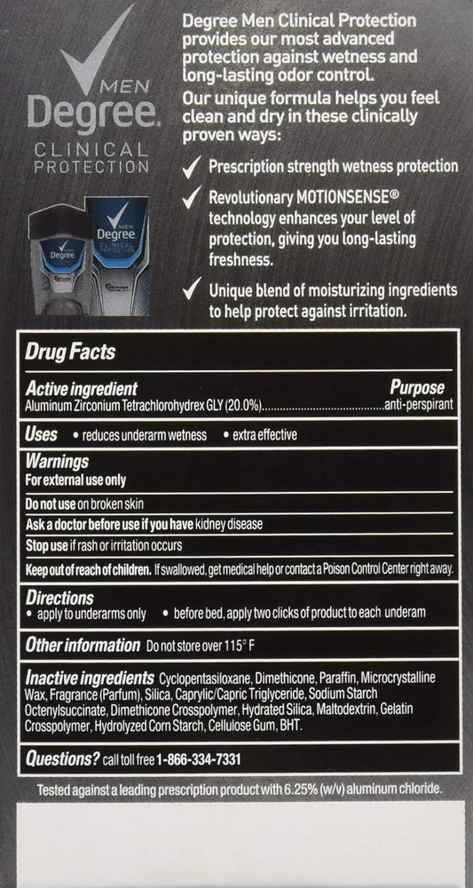Product Description Degree Men, Clinical Protection, Antiperspirant Deodorant, Soft Solid, Clean, 1.7 Ounce (Pack Of 24) Degree Clinical Protection Long Lasting Antiperspirant Deodorant Stick, Clean, Degree Men Clinical Protection Clean Antiperspirant Deodorant delivers prescription-strength wetness protection with 72-hour sweat and odor control to keep you feeling dry and fresh. Our breakthrough motionsense technology works in sync with your body, all day long. This Antiperspirant deodorant releases a clean, masculine scent every time you move. The powerful, prescription-strength Antiperspirant deodorant responds when you need it most, so you can stay confident without having to worry about slowing down. PRESCRIPTION-STRENGTH PROTECTION: Active lives need Degree Men Clinical Protection Clean Antiperspirant Deodorant. This Antiperspirant for men delivers prescription-strength wetness protection MOTIONSENSE® TECHNOLOGY: Our breakthrough MotionSense® technology works in sync with your body all day long. This deodorant for men releases a subtle burst of fragrance every time you move READY FOR WHAT'S NEXT: Take on the day with Degree Men Clinical Protection Clean Antiperspirant Deodorant stick. Simply twist, glide, and move UNSTOPPABLE FRESHNESS: Stay fresh, longer with this Antiperspirant. Degree Men Clinical Protection Clean Antiperspirant Deodorant features a clean, masculine scent to keep you feeling energized RECYCLE WITH DEGREE: As well as increasing our use of reusable materials, we're making it easier for you to recycle our Antiperspirant and dry spray packaging Clean Clinical Antiperspirant Deodorant: Provides 24-hour protection against sweat and odor Neutral Scent: Unisex fragrance won't overpower you or your partner Ingredients Active ingredient: Aluminum Zirconium Tetrachlorohydrex GLY (20%); Inactive ingredients: Cyclopentasiloxane, dimethicone, paraffin, microcrystalline wax, fragrance (parfum), silica, caprylic/capric triglyceride, sodium starch octenylsuccinate, dimethicone crosspolymer, hydrated silica, maltodextrin, gelatin crosspolymer, hydrolyzed corn starch octenylsuccinate, cellulose gum, and BHT