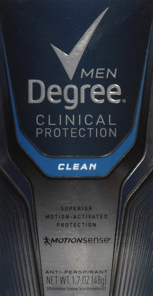 Product Description Degree Men, Clinical Protection, Antiperspirant Deodorant, Soft Solid, Clean, 1.7 Ounce (Pack Of 5) Degree Clinical Protection Long Lasting Antiperspirant Deodorant Stick, Clean, Degree Men Clinical Protection Clean Antiperspirant Deodorant delivers prescription-strength wetness protection with 72-hour sweat and odor control to keep you feeling dry and fresh. Our breakthrough motionsense technology works in sync with your body, all day long. This Antiperspirant deodorant releases a clean, masculine scent every time you move. The powerful, prescription-strength Antiperspirant deodorant responds when you need it most, so you can stay confident without having to worry about slowing down. PRESCRIPTION-STRENGTH PROTECTION: Active lives need Degree Men Clinical Protection Clean Antiperspirant Deodorant. This Antiperspirant for men delivers prescription-strength wetness protection MOTIONSENSE® TECHNOLOGY: Our breakthrough MotionSense® technology works in sync with your body all day long. This deodorant for men releases a subtle burst of fragrance every time you move READY FOR WHAT'S NEXT: Take on the day with Degree Men Clinical Protection Clean Antiperspirant Deodorant stick. Simply twist, glide, and move UNSTOPPABLE FRESHNESS: Stay fresh, longer with this Antiperspirant. Degree Men Clinical Protection Clean Antiperspirant Deodorant features a clean, masculine scent to keep you feeling energized RECYCLE WITH DEGREE: As well as increasing our use of reusable materials, we're making it easier for you to recycle our Antiperspirant and dry spray packaging Clean Clinical Antiperspirant Deodorant: Provides 24-hour protection against sweat and odor Neutral Scent: Unisex fragrance won't overpower you or your partner Ingredients Active ingredient: Aluminum Zirconium Tetrachlorohydrex GLY (20%); Inactive ingredients: Cyclopentasiloxane, dimethicone, paraffin, microcrystalline wax, fragrance (parfum), silica, caprylic/capric triglyceride, sodium starch octenylsuccinate, dimethicone crosspolymer, hydrated silica, maltodextrin, gelatin crosspolymer, hydrolyzed corn starch octenylsuccinate, cellulose gum, and BHT