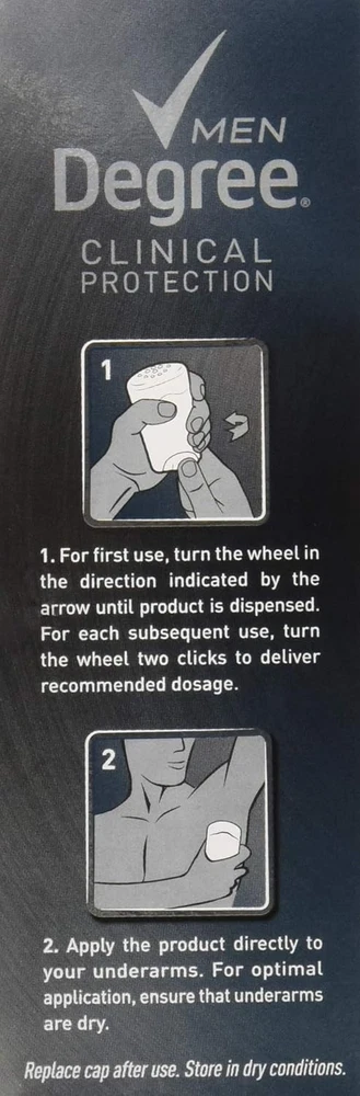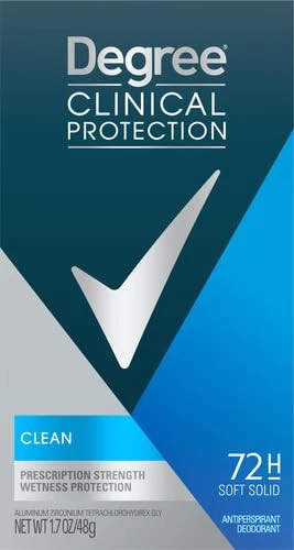 Product Description Degree Men, Clinical Protection, Antiperspirant Deodorant, Soft Solid, Clean, 1.7 Ounce (Pack Of 8) Degree Clinical Protection Long Lasting Antiperspirant Deodorant Stick, Clean, Degree Men Clinical Protection Clean Antiperspirant Deodorant delivers prescription-strength wetness protection with 72-hour sweat and odor control to keep you feeling dry and fresh. Our breakthrough motionsense technology works in sync with your body, all day long. This Antiperspirant deodorant releases a clean, masculine scent every time you move. The powerful, prescription-strength Antiperspirant deodorant responds when you need it most, so you can stay confident without having to worry about slowing down. PRESCRIPTION-STRENGTH PROTECTION: Active lives need Degree Men Clinical Protection Clean Antiperspirant Deodorant. This Antiperspirant for men delivers prescription-strength wetness protection MOTIONSENSE® TECHNOLOGY: Our breakthrough MotionSense® technology works in sync with your body all day long. This deodorant for men releases a subtle burst of fragrance every time you move READY FOR WHAT'S NEXT: Take on the day with Degree Men Clinical Protection Clean Antiperspirant Deodorant stick. Simply twist, glide, and move UNSTOPPABLE FRESHNESS: Stay fresh, longer with this Antiperspirant. Degree Men Clinical Protection Clean Antiperspirant Deodorant features a clean, masculine scent to keep you feeling energized RECYCLE WITH DEGREE: As well as increasing our use of reusable materials, we're making it easier for you to recycle our Antiperspirant and dry spray packaging Clean Clinical Antiperspirant Deodorant: Provides 24-hour protection against sweat and odor Neutral Scent: Unisex fragrance won't overpower you or your partner Ingredients Active ingredient: Aluminum Zirconium Tetrachlorohydrex GLY (20%); Inactive ingredients: Cyclopentasiloxane, dimethicone, paraffin, microcrystalline wax, fragrance (parfum), silica, caprylic/capric triglyceride, sodium starch octenylsuccinate, dimethicone crosspolymer, hydrated silica, maltodextrin, gelatin crosspolymer, hydrolyzed corn starch octenylsuccinate, cellulose gum, and BHT