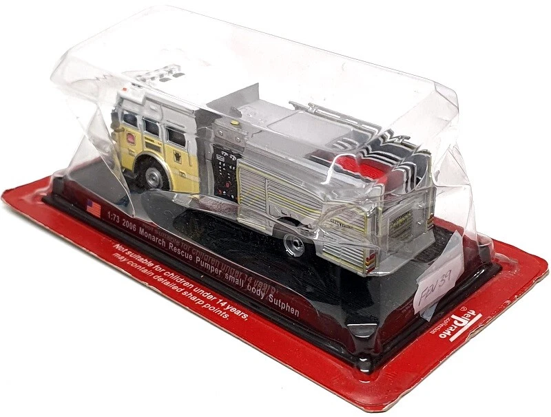 Del Prado 1/73 Scale FEN39 - 2006 Sutphen Rescue Pumper Fire Truck Contact Us Home About Us Feedback Contact Us Add to favourites Del Prado 1/73 Scale FEN39 - 2006 Sutphen Rescue Pumper Fire Truck click thumbnails above to enlarge Shop Home Our Feedback Ask a Question Product Description 1/73 Scale Diecast & Plastic Model by Del Prado The MODEL is in MINT condition. SUPPLIED WITH PLINTH IN DISPOSABLE BLISTER PACK. SEE IMAGES FOR BEST DESCRIPTION AND GRADING CONDITIONS. Product Details Scale 1/73 Material Diecast & Plastic Brand Del Prado EAN 7427317329380 Additional Info GRADING CONDITIONS MINT - The item is in perfect condition. NEAR MINT - Almost perfect, any imperfections will be extremely minor. EXCELLENT - The item will have had very careful use, with only small imperfections. GOOD - The item will have had more use, showing obvious imperfections. FAIR - The item will have heavy signs of wear, showing major imperfections. SPARES or REPAIR - The item will be in a poor condition. Payment Shipping Returns About Us Methods of Payment Our preferred method of payment is Paypal. Any questions please ask! Thanks. WORLDWIDE MAIL-ORDER SPECIALISTS Shipping within the UK is FREE OF CHARGE - Plese see the eBay postage tab for other worldwide shipping charges. We ship from our warehouse is the UK. We ship worldwide everyday using a Tracked / Signed For service. Over 30 years of experience shipping collectible models worldwide - you can trust our service. Any questions, please ask. Thanks for looking ! Returns We hope you are completely satisfied with your purchase. In the unlikely event that there is a problem / fault with the item we will happily provide you with a refund (excluding returns postage). About Us R.M.Toys Ltd is a family led company with over 50 years worth of experience specialising in high quality collectable models & worldwide delivery. We have continued to expand and develop as the retail market and technology has evolved and we are in no doubt we will need to continue with that trend so we hope we have been able to showcase our service and provide you, our customer, with everything you have required. Our aim is to ensure no matter what the model, we will provide an excellent service experience. To us, this means great availability, excellent customer service as well as quick & secure delivery, to anywhere across the world. All that is left to say is Thank You for taking the time to read our page and using our company to assist with your collection and gift needs - every order placed is gratefully received and as important to us as the next. Kind Regards The RM Toys Team R.M.Toys Ltd - All Rights Reserved || Design by Tapika Store The MODEL is in MINT condition. SUPPLIED WITH PLINTH IN DISPOSABLE BLISTER PACK. SEE IMAGES FOR BEST DESCRIPTION AND GRADING CONDITIONS.