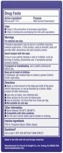 PRODUCT DESCRIPTION : Trojan Extended Pleasure Delay Spray for Men – Maximize Control & Satisfaction in Intimate Moments Gain Greater Control Over Climax: Specifically crafted to address premature ejaculation, Trojan Extended Pleasure Delay Spray is designed for men who want to last longer in bed and take control of their intimate experiences. By subtly desensitizing the area, this delay spray helps extend performance, allowing you and your partner to enjoy more fulfilling, prolonged moments of intimacy. Scientifically-Formulated for Optimal Results: This advanced spray features a carefully selected blend of mild desensitizing agents to reduce sensitivity just enough for a longer-lasting experience, without diminishing pleasure. You’ll still feel connected and present in the moment, with enhanced stamina that makes every intimate encounter more satisfying. Quick, Easy Application for Seamless Integration: Using Trojan Extended Pleasure Spray is straightforward. Simply apply a few sprays directly onto the targeted area before intimacy, and let it absorb for quick, effective action. The fast-acting formula allows you to stay in the moment, with no waiting or disruption to your intimate connection. Non-Greasy, Fast-Absorbing Formula for Comfort: Designed for comfort, this delay spray has a lightweight, non-greasy texture that won’t leave any sticky residue. It quickly absorbs into the skin, ensuring both you and your partner enjoy a smooth, residue-free experience that keeps the focus on connection and pleasure. Conveniently Sized for Privacy and Portability: Trojan understands the need for discretion and convenience, so this spray is packaged in a small, travel-friendly bottle that’s easy to carry and use as needed. Its compact size allows you to keep it within reach, so you’re always prepared for spontaneous moments. Expertly Developed by a Trusted Brand: Backed by Trojan’s commitment to quality, this delay spray is created with a focus on reliability and safety, ensuring it meets the high standards that Trojan has built its reputation on. You can trust in Trojan’s expertise to bring you a product designed for performance, comfort, and satisfaction. Enhance Your Intimate Confidence: By helping to delay climax, Trojan Extended Pleasure Spray lets you approach each intimate moment with confidence. Feel empowered to make the most of your time together, knowing that you have greater control and can focus on building a deeper, more satisfying connection with your partner.
