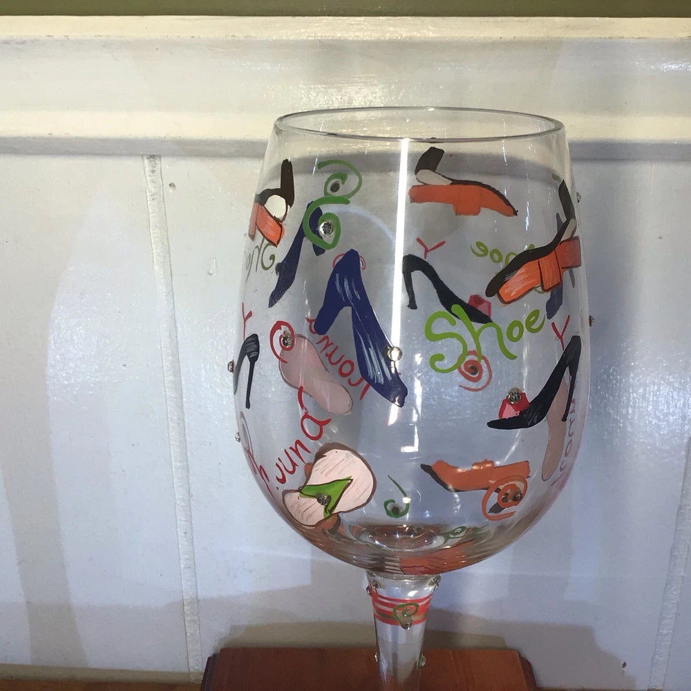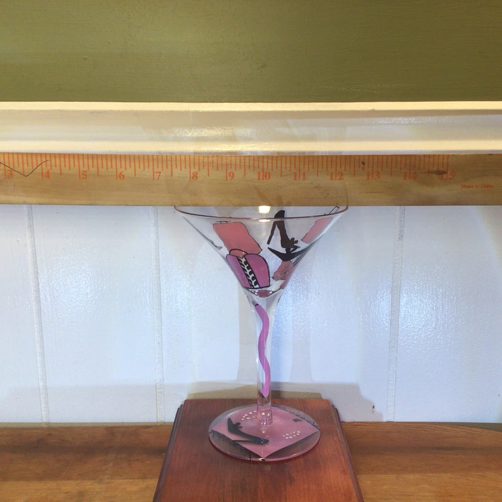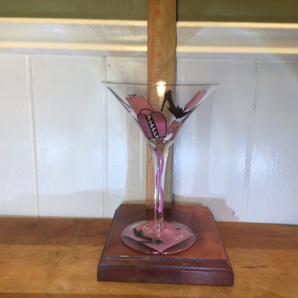 This is a set of two hand-painted crystal wine glasses with a contemporary abstract design featuring shoes and purses. Each glass has a round shape and a capacity of 15 oz. The brand is Fifth Avenue Crystal ( wine glass) and Lolita ( martini glass). These glasses are ideal for all occasions and are perfect for adults.