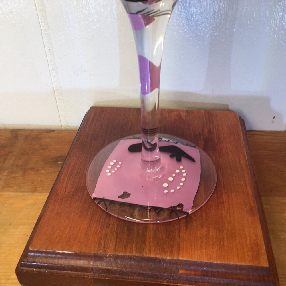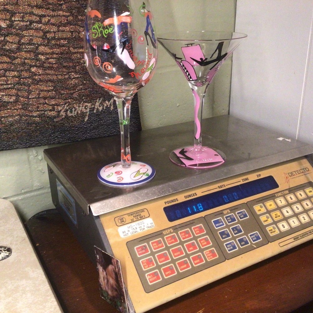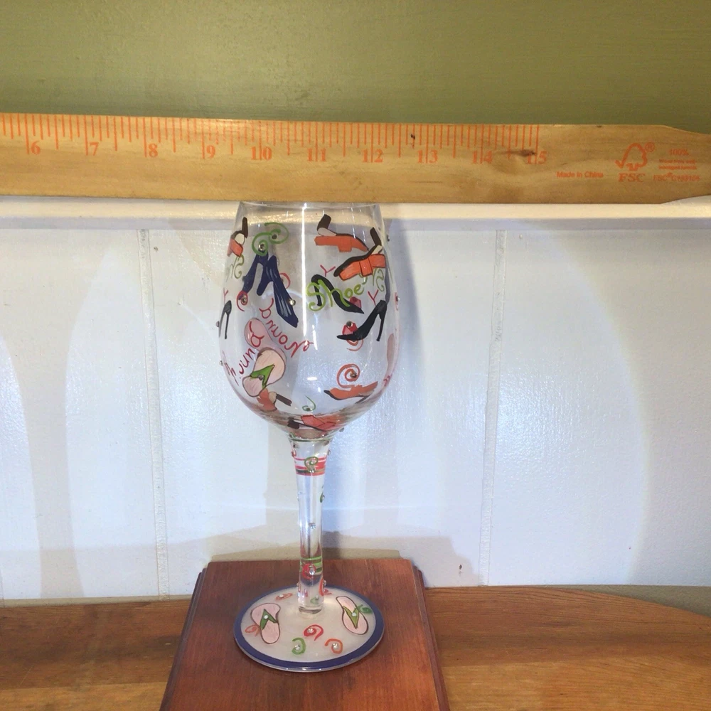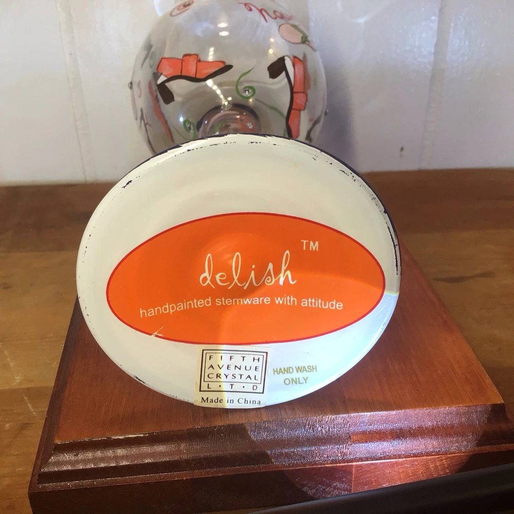 This is a set of two hand-painted crystal wine glasses with a contemporary abstract design featuring shoes and purses. Each glass has a round shape and a capacity of 15 oz. The brand is Fifth Avenue Crystal ( wine glass) and Lolita ( martini glass). These glasses are ideal for all occasions and are perfect for adults.