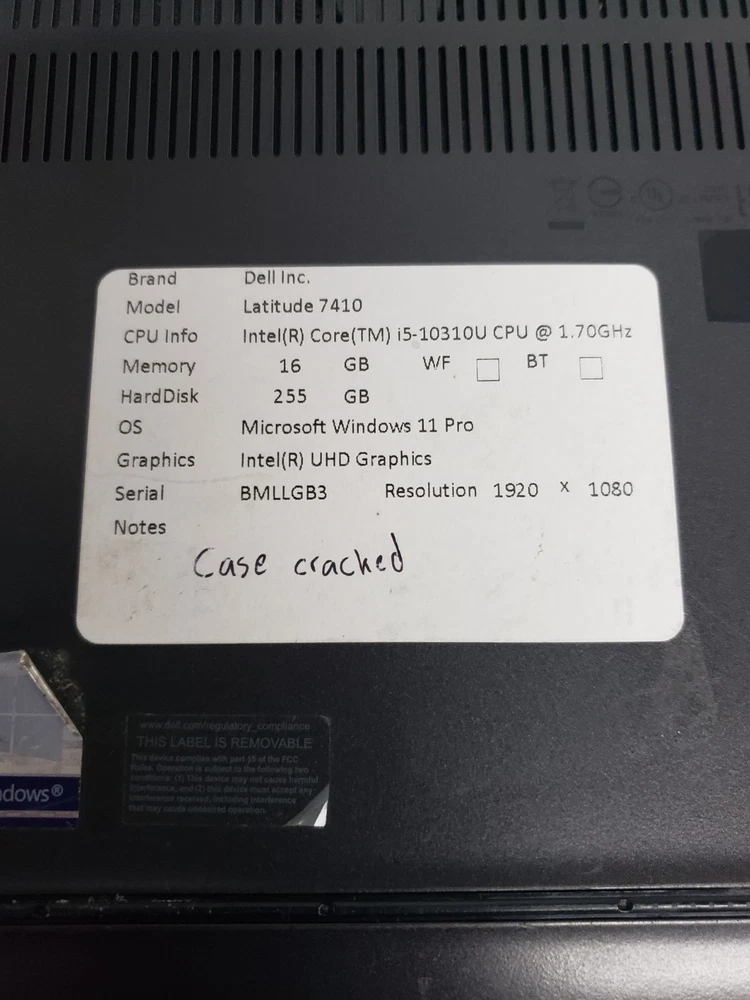 Dell Latitude 7410 i5-10310U 1.7GHz 16GB Ram 256GB SSD Win 11 Pro Also Charger Is included, Ms office 2013, Has scratches on the bottom And the Case is Cracked Everything Works Great Please See Pictures
