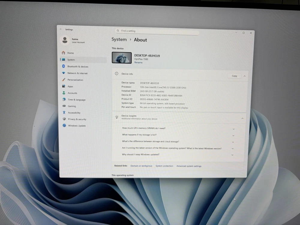 Dell OptiPlex Small Form Factor 7000 Intel Core i5 12th Gen i5-12500 Tetradeca-core (14 Core) 2.50 GHz . 24 GB RAM DDR4 256 GB M.2 PCI Express NVMe SSD Small Form Factor - Black Graphics Card -- 128 MB Intel (R) UHD Graphics 770 Windows Specification Edition -- Windows 11 Pro (Genuine / Active) Version -- 25H2 System Type - 64-bit operating system, x64-based processor Microsoft Office 2024 Professional - (Genuine / Active) Product information Technical Details Screen Resolution -- 3840 x 2160 Max Screen Resolution -- 3840x2160 Processor -- i5 Tetradeca-core (14 Core) 2.50 GHz RAM -- 24 GB DDR4 Hard Drive -- 256 GB M.2 PCI Express NVMe SSD Graphics Coprocessor -- Intel UHD Graphics 770 -128 MB Card Description – Integrated Wireless Type -- Wi-Fi 6E (WiFi 802.11ax) Front Ports: 1x USB 2.0 (480 Mbps) port 1x USB 2.0 (480 Mbps) port with PowerShare 1x USB 3.2 Gen 2 (10 Gbps) port 1x USB 3.2 Gen 2x2 (20 Gbps) Type-C port Rear: 2x USB 2.0 ports (480 Mbps) with Smart Power On 1x USB 3.2 Gen 2 (10 Gbps) port 3x USB 3.2 Gen 1 (5 Gbps) ports Network port 1x RJ45 Ethernet port, 1 GHz Video port 3x Three DisplayPort 1.4a (HBR2) Other Technical Details Brand – Dell Series -- OptiPlex 7010 Item model number – 7010 Hardware Platform -- PC Operating System -- Windows 11 Pro Item Weight -- 10.74 pounds Item Dimensions LxWxH -- 10 x 15 x 19 inches Color – Black Processor Brand – Intel Number of Processors – 6 Computer Memory Type -- DDR4 SDRAM Hard Drive -- NVMe (M2 / 2280 gen 3) What's in the box OptiPlex SFF 7010 Power Cord (US) Keyboard Mouse