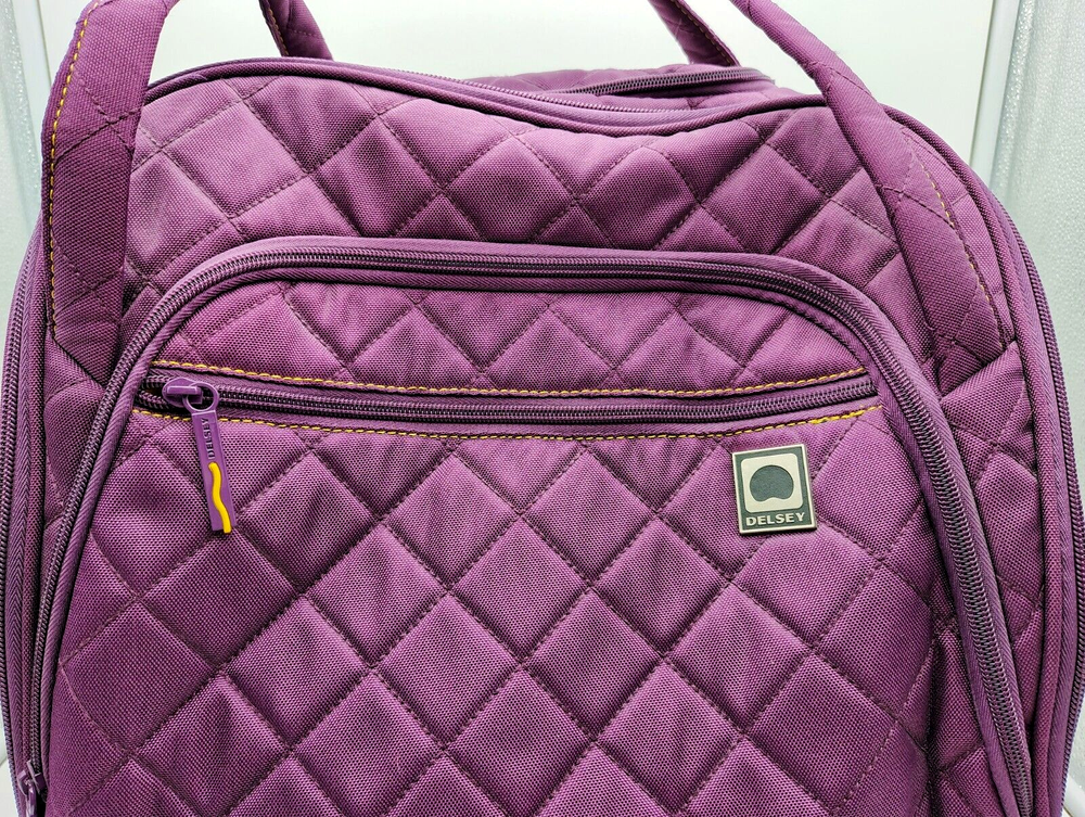 Pattern:Quilted SolidSize:15"Features:Carry On, Laptop Compartment, Soft Case, Water Bottle Pocket, Wheels/Rolling, Luggage Bandgtin13:Does not applyType:Underseat LuggageCountry/Region of Manufacture:ChinaUPC:Does not applyColor:Plum Exterior/Yellow InteriorBrand:DELSEY