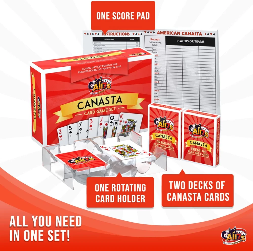 CANASTA SET - Bring the fun to your game nights with this beautiful canasta cards set with card trays for playing cards and score pad. Gather your family and friends for the ultimate card game! EASY CARD GAMES FOR ADULTS - This classic card game for family game night will keep your whole family entertained and playing making it a perfect game night activity. This is the perfect game gift set for family game night! LARGE PRINT CARDS WITH POINT VALUES - The large print values makes this a great card game for seniors, and the point values will make it easy to see and count your score regardless of your age! HAND AND FOOT CARD GAME SET - Looking for canasta games playing cards with 2 deck rotating card tray holder set but also want to play hand and foot game? Just add 2 more decks of Canasta to play! PERFECT GIFT: these canasta playing cards makes a great family card games for families, whether to enjoy with adults 2-4 players or a fun afternoon with your friends. Product Description The video showcases the product in use. The video guides you through product setup. The video compares multiple products. The video shows the product being unpacked. More games from the makers of Deluxe Canasta Card Set Add to Cart Add to Cart Add to Cart Add to Cart Add to Cart Add to Cart Add to Cart Customer Reviews 4.6 out of 5 stars 147 4.6 out of 5 stars 347 4.6 out of 5 stars 50 4.5 out of 5 stars 47 4.4 out of 5 stars 2,685 4.6 out of 5 stars 2,695 4.2 out of 5 stars 230 Price $49.97 $ 49 . 97 $21.97 $ 21 . 97 $14.97 $ 14 . 97 $16.97 $ 16 . 97 $11.97 $ 11 . 97 $22.97 $ 22 . 97 $9.97 $ 9 . 97 Number of Players 2-8 Players — 3-8 Players Unlimited Unlimited Unlimited Unlimited Age 8+ 3+ 7+ 3-8 3-8 3-8 3-8 Family Friendly ✔ ✔ ✔ ✔ ✔ ✔ ✔ Great for Kids, Teens, Adults ✔ ✔ ✔ ✔ ✔ ✔ ✔ Travel Friendly Games ✔ ✔ ✔ ✔ ✔ ✔ ✔ Unlimited Fun and Play ✔ ✔ ✔ ✔ ✔ ✔ ✔ Perfect Gift Choice ✔ ✔ ✔ ✔ ✔ ✔ ✔ With Instructions ✔ ✘ ✔ ✔ ✔ ✔ ✔