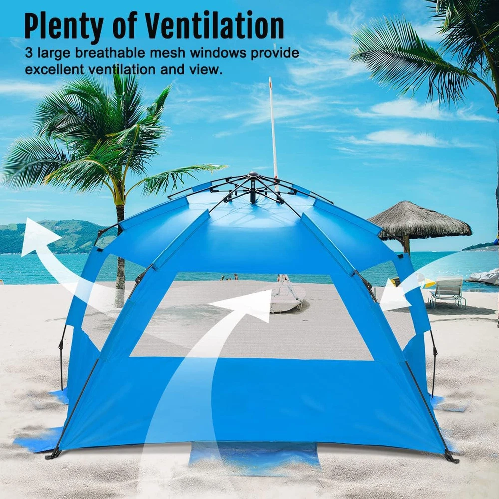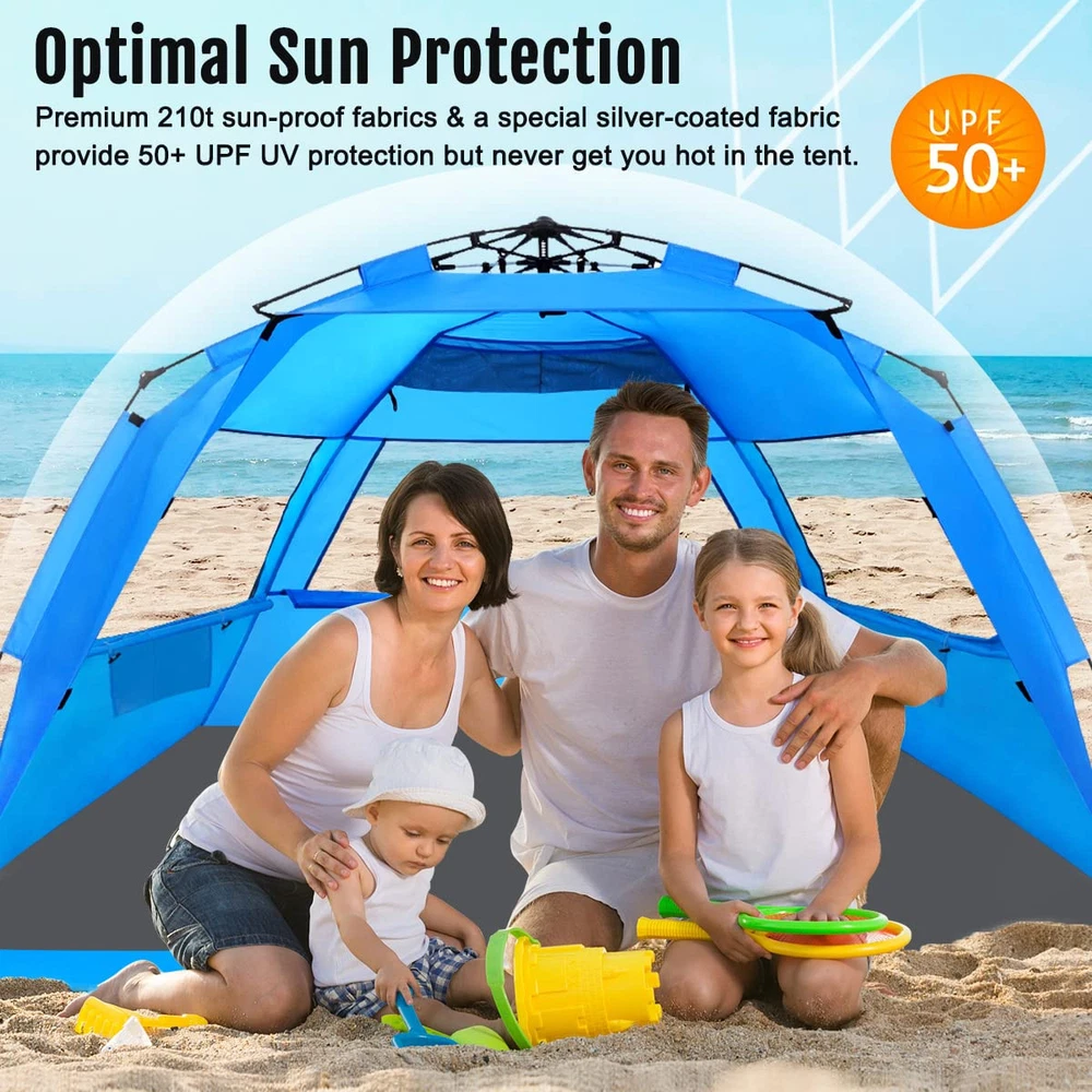 Larger Space at a More Affordable Price - A size upgrade to 99"L x 55"W x 55"H, enough space for 2 adults plus 2 kids. Easy Set Up with Stability Accessories & Easy to Carry - Quick popping mechanism allows to set up in seconds! Includes 5 attached sandbags, 6 steel stakes, 6 sand stakes & tiedown strings to provide more stability; lightweight and easy to fold back with a compact carrying bag for easy transport and storage. Outdoor Protection & Great Ventilation - Premium 210t sun-proof material plus a special embedded silver-coated material to provide great UV protection from the sun and 3 added roll up openings maintain airflow to keep the tent cool when staying inside. Privacy Option - An extended front floor provides extra space for more activities and can be closed with adhesive Velcro straps when private moment protection is needed, such as breastfeeding or clothes changing. 's Customer Friendly Service is Always There for You - If you need help of any kind with your beach tent, please don't hesitate to contact us; we are always striving for continuous improvement and that cannot be done without your support.