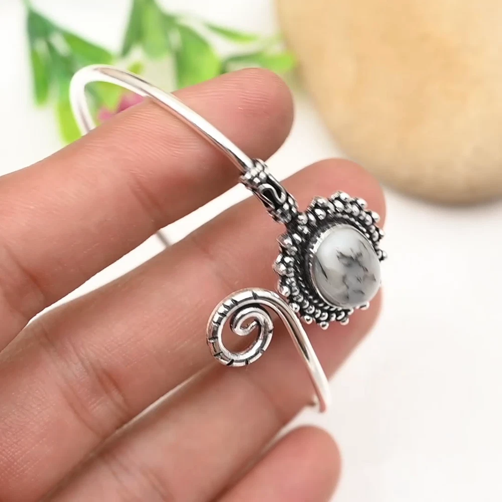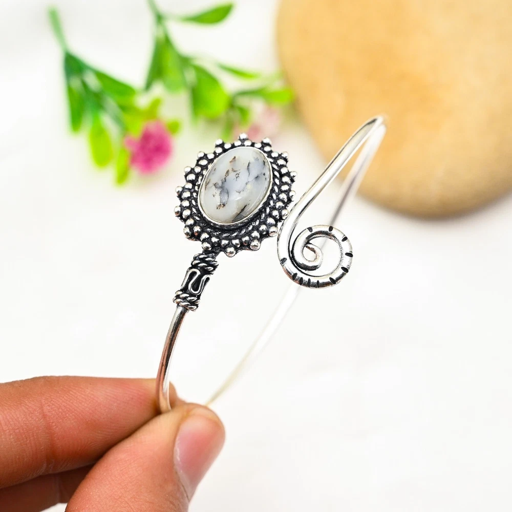 Brand:HandmadeFeatures:AdjustableColored Diamond Intensity:N/AMain Stone Width:N/ATheme:Beauty, Bohemian, Ethnic, Halloween, LoveCollection:HandmadeCountry/Region of Manufacture:IndiaMetal Purity:925Number of Gemstones:1Main Stone Length:N/AColor:SilverType:BangleMain Stone Shape:OvalSetting Style:BezelCut Grade:ExcellentOccasion:Anniversary, Birthday, Christmas, Engagement, Mother's Day, Valentine's Day, WeddingCountry of Origin:IndiaClosure:AdjustableChain Type:N/AMain Stone Color:WhiteDiamond Clarity Grade:N/AMaterial:GemstoneShape:Same As PictureDiamond Color Grade:N/AMain Stone Treatment:Not EnhancedTotal Carat Weight:10 carat and aboveSecondary Stone:N/AMain Stone Creation:NaturalStyle:CuffMain Stone Depth:N/AItem Length:AdjustableMain Stone:Dendritic OpalNumber of Diamonds:N/AMetal:Sterling SilverBase Metal:Sterling SilverCharm Type:Same As PictureCertification:N/A