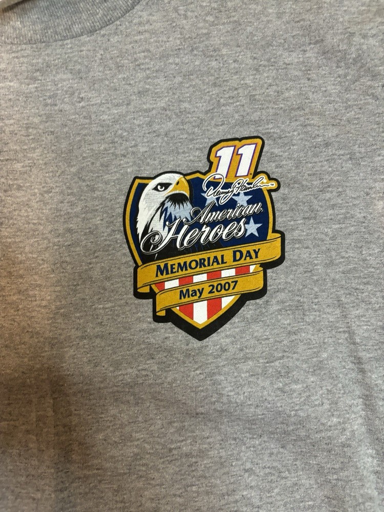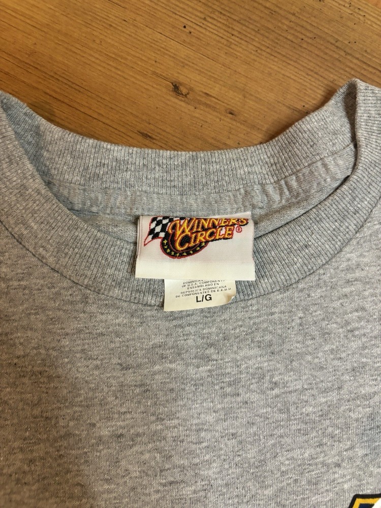 The product is a Denny Hamlin #11 NASCAR T-shirt by Winners Circle, featuring the driver's name and team, Joe Gibbs Racing. This officially licensed shirt in size L is designed in gray color, suitable for both men and women who are fans of auto racing and specifically NASCAR. The shirt commemorates Denny Hamlin and his association with Gibbs Racing, making it a perfect memorabilia item for supporters of the racing team.