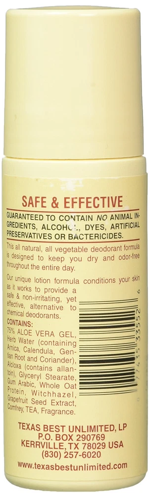 Aloe and Almonds All Natural Roll On Deodorant, 3 Ounce -- 6 per case. alcohol, dyes, artificial preservatives or bactericides This all natural, all vegetable deodorant formula is designed to keep you dry and odor-free throughout the entire day. This unique lotion formula conditions your skin as it works to provide a safe and non-irritating, yet effective, alternative to deodorants. Ingredients: 75% ALOE VERA , Herb Water (containing Arnica, Calendula, Gentian Root and Coriander), Alcloxa (contains allantoin), Glyceryl Stearate, Gum Arabic, Whole Oat Protein, Witch hazel, Grapefruit Extract, Comfrey, TEA, Fragrance. This Unique Lotion Formula Conditions Your Skin As It Works To Provide A Safe And Non-Irritating, Yet Effective, Alternative To Deodorants. Ingredients: 75% Aloe Vera , Herb Water.