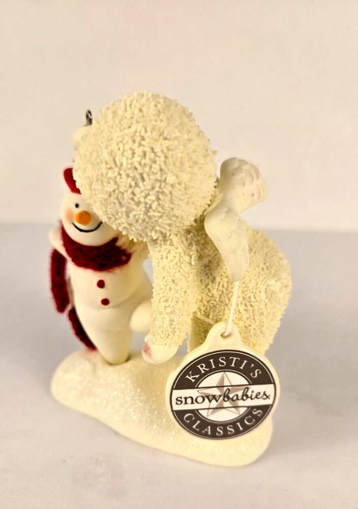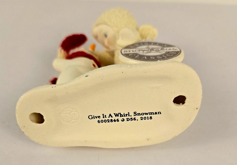 Department 56 Snowbabies "Give It a Whirl" Snowman Figurine This Department 56 Snowbabies figurine features a Snowbaby dancing with a snowman friend. The figurine is a cream and red color scheme. It is made of bisque porcelain with a textured finish, and is hand-painted. It measures 3 inches in length, 4 inches in height, and 1 1/2 inches in width. The item is part of the Snowbabies collection, designed by Kristi Jensen Pierro. It is retired and weighs 3 ounces. This piece is designed to evoke feeling of love, friendship, or inspiration. We carefully pack each item to prevent breakage. We only charge what the shipper charges and cannot control the shipping costs. We do not accept returns/refunds unless item is not as described per eBay policy or the item arrives damaged or broken beyond anything noted in the condition field or pictures. If you have any questions about any of our listed items, feel free to email us.