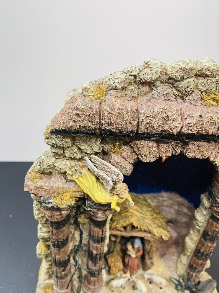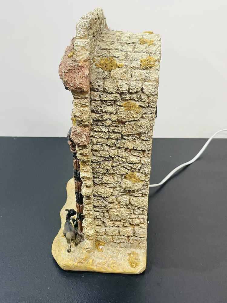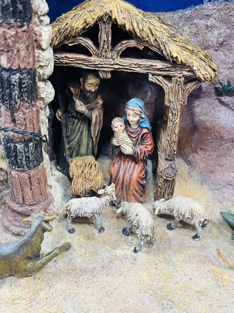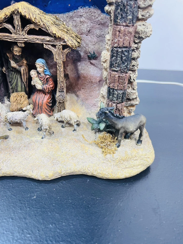 The department 56 starry night over Bethlehem is in good working condition. It does have a couple areas that are damaged, such as the donkeys tail and the cows horn , as well as one spot on the side that is missing a bit of the moss . it measures 13 1/2 inches high by 11 inches long by 6 inches wide . No box.