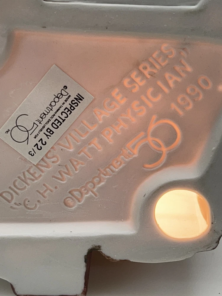 Dept 56 "C.H. Watt Physician" from the Heritage Village Collection is a medium-sized illuminated porcelain house suitable for a Christmas village display. This Victorian-style house, part of the Dickens Village Series, features hand-painted details and is boxed. It is an original retired item from 1990, portraying the character C. H. Watt Physician in a whimsical, multicolor design. Perfect for a seasonal display in any room during the late 20th century. Incredible detail! All original packaging including light & cord .