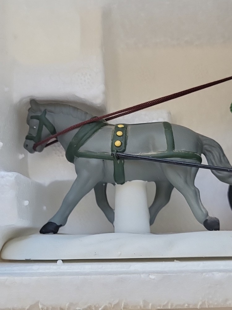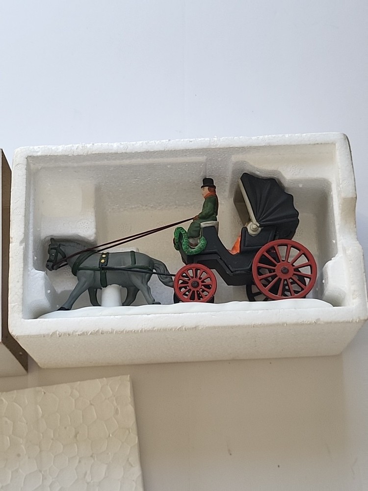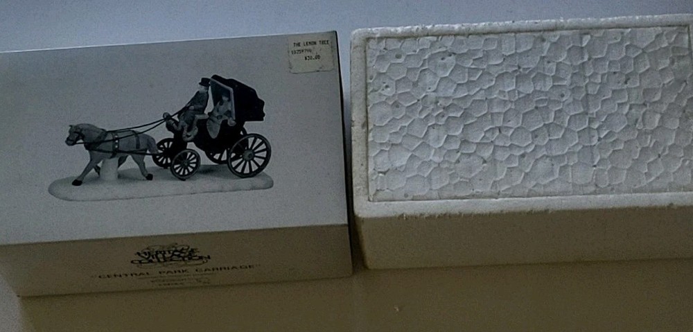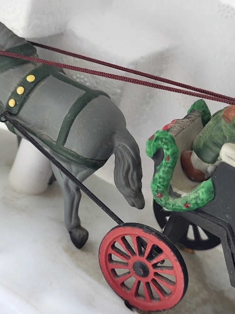 Missing 1 of the lower black straps from carriage to horse. We never noticed and just faced item with good side out. Discount priced accordingly. Please see Detailed Photos 📸 for Item Condition and Specifics Fast Shipping 🚢 The Dept 56 Central Park Carriage from the 1989 Heritage Village Collection is a small, hand-painted ceramic and porcelain carriage featuring an asymmetrical Victorian design. It measures 7 1/4 inches in length, 4 inches in height, and 2 5/8 inches in width, making it suitable for display in any room or as part of a Christmas village setup. The carriage is themed around Central Park and depicts a winter scene, perfect for adding a festive touch to your holiday decor. It comes in its original box and is a charming piece for collectors of seasonal village items.