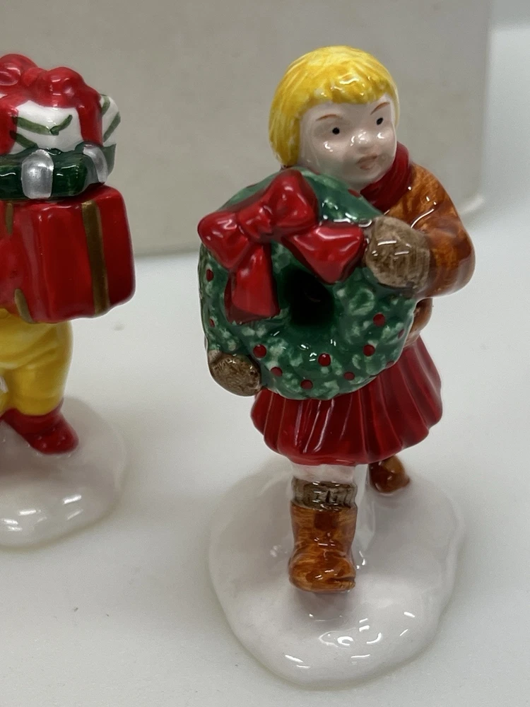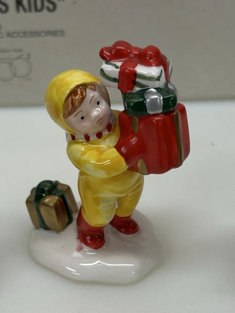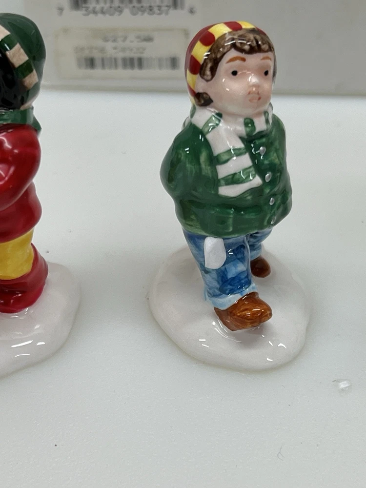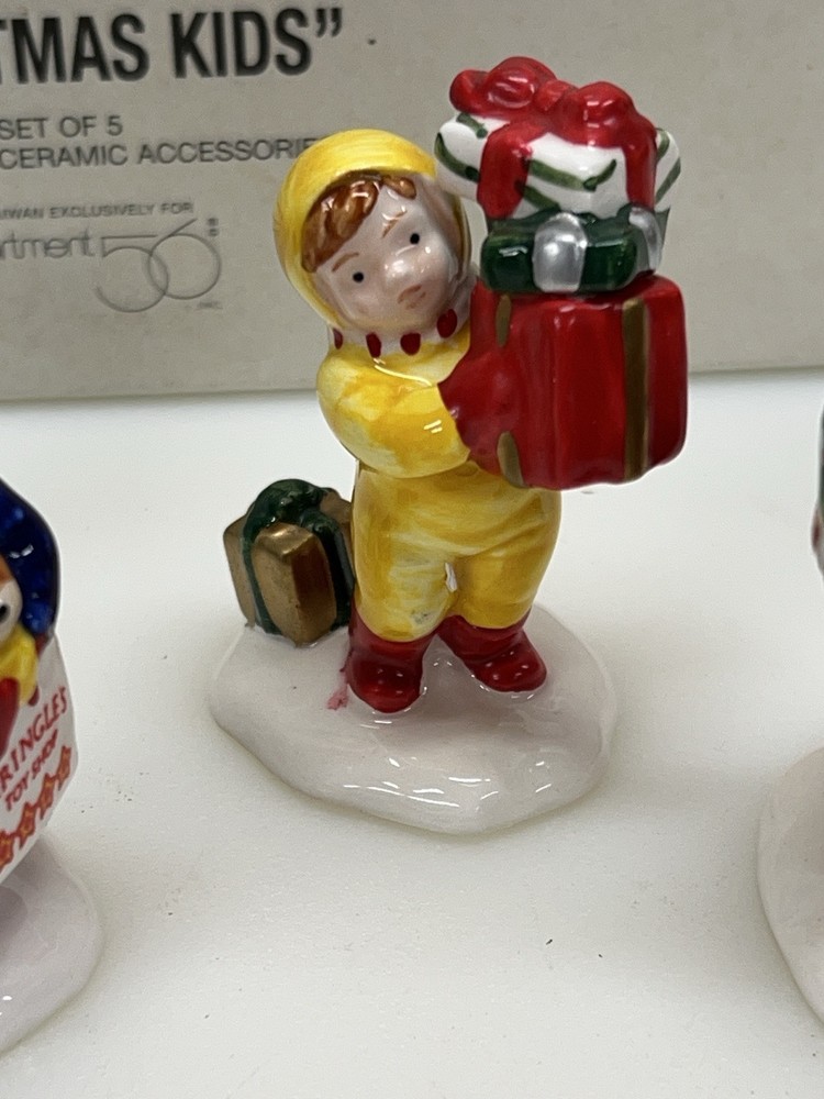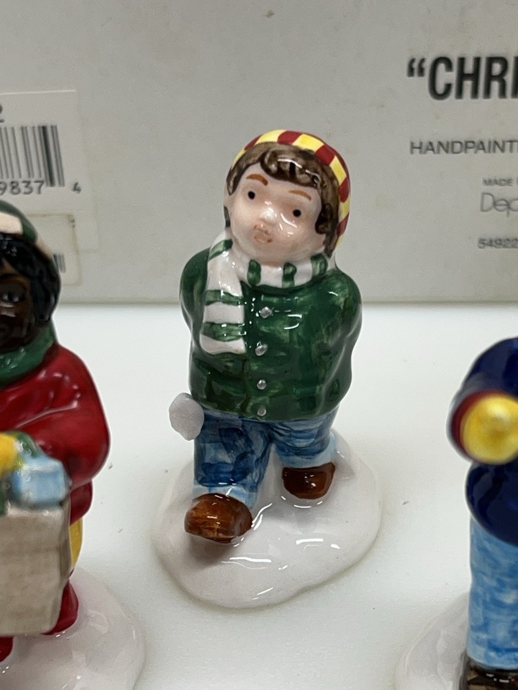 Dept 56 "Christmas Kids" The Original Snow Village 54992 Set Of 5 is a small set of ceramic and porcelain figurines from 1996. This American-style Christmas Village Kids collection features whimsical village kids in a multicolor painted finish. The set is part of the Snow Village series by Department 56, depicting seasonal scenes with a theme of Village People in a festive Christmas setting. The set comes in its original box packaging. Perfect pristine condition