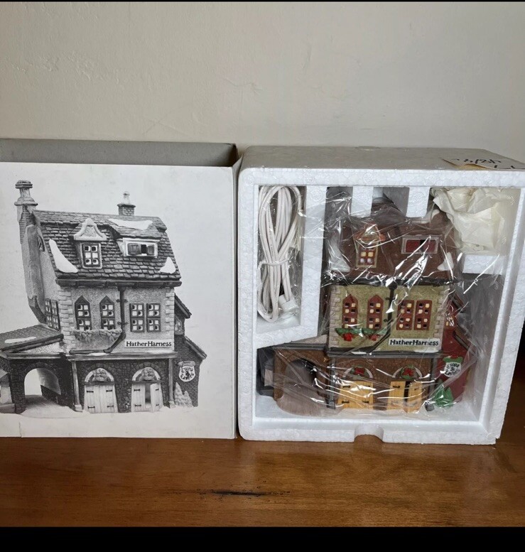 Add a piece of Victorian charm to your holiday decor with this Department 56 Dickens Heritage Christmas Village piece. The Harness Shop features hand-painted matte finish and intricate details, making it a unique addition to any room. This illuminated ceramic and porcelain building is suitable for window, floor, stairs, or furniture display, and is perfect for those who love Charles Dickens' work. This retired piece from the Heritage Village collection depicts a horse harness seller in a bustling Christmas market, and is part of a set of four buildings. The item measures 8" tall, 7 1/2" wide, and 4 1/4" deep, and weighs 2 lbs. It comes in its original box, and is an original piece from the 1990s. Perfect for collectors and those looking for a unique holiday decoration.