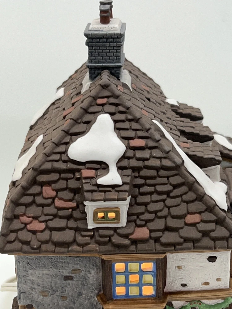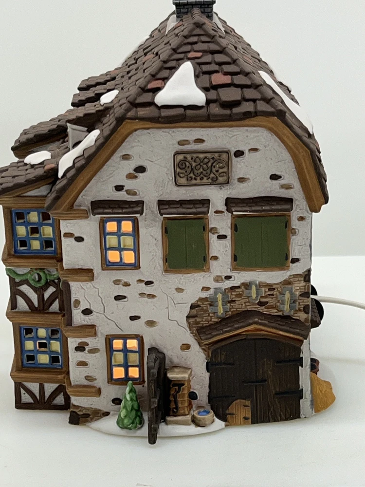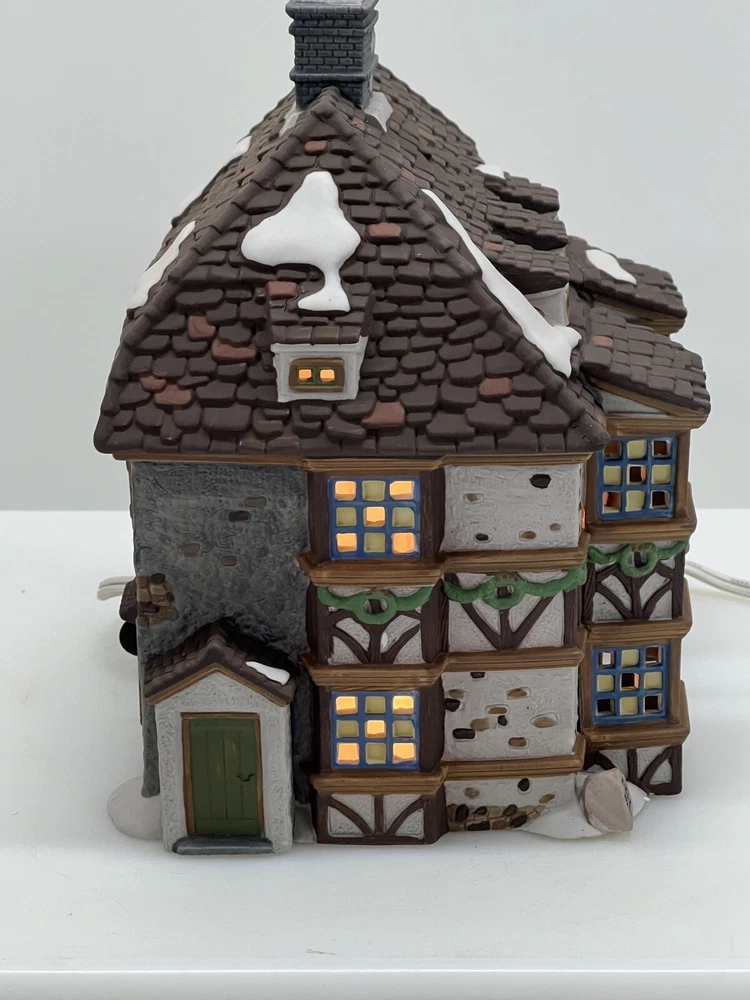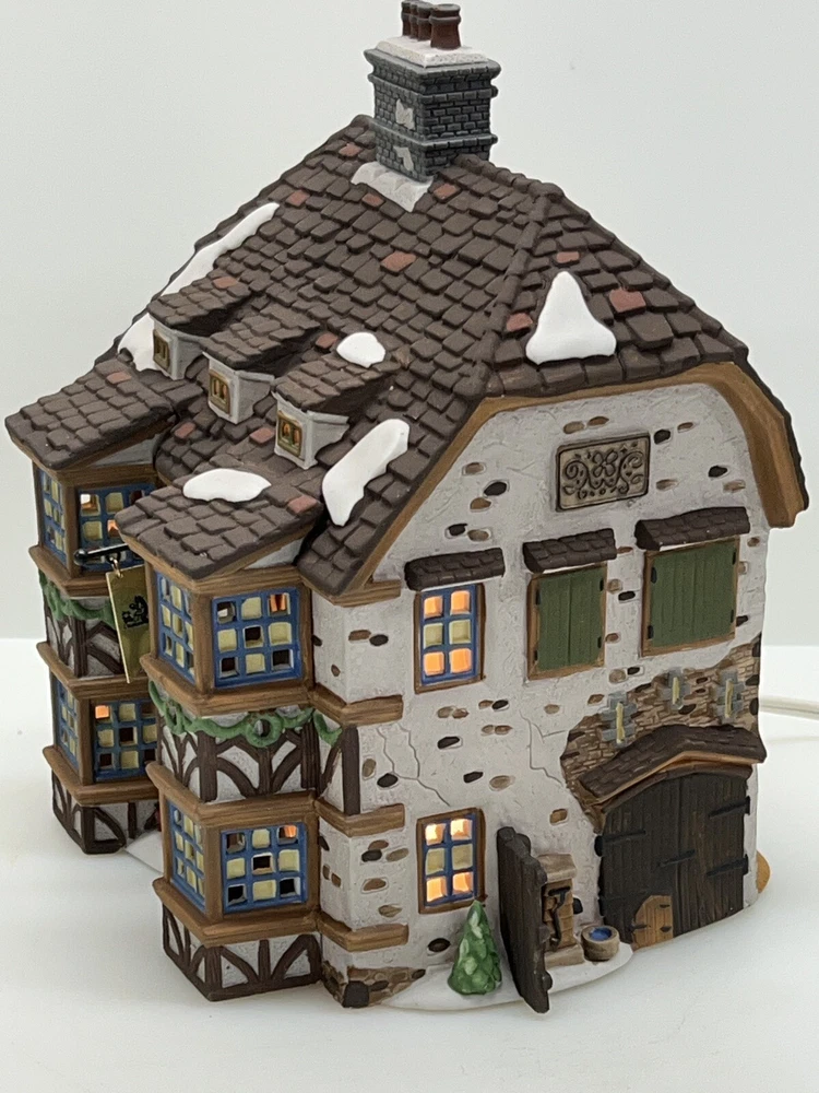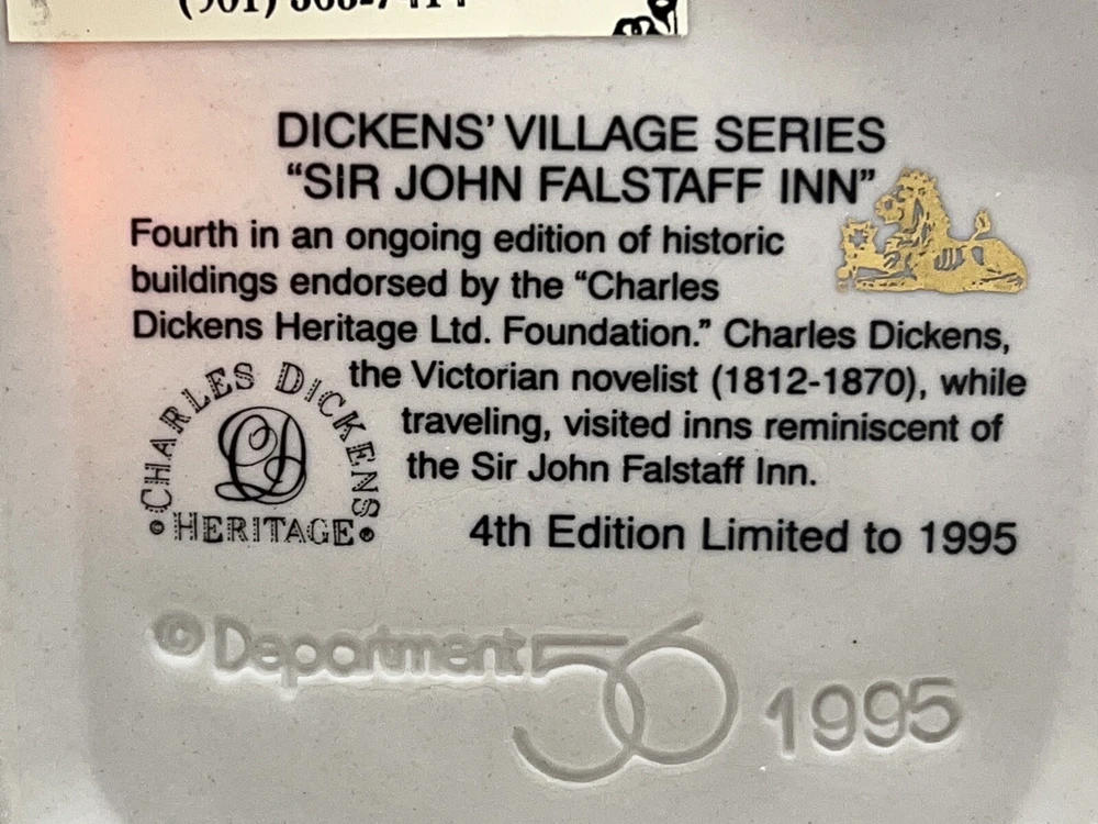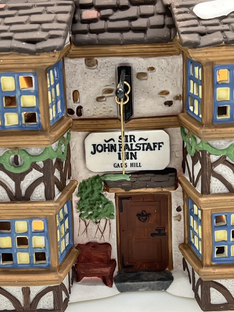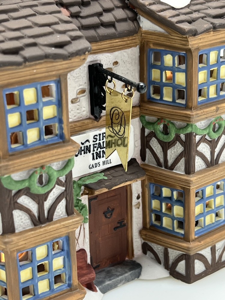 Dept 56 Dickens Heritage Village Series Sir John Falstaff Inn 57533 is a medium-sized Victorian-style ceramic and porcelain house from 1995. It is hand-painted, illuminated, and suitable for indoor seasonal display. The multicolor house is 8 1/2" tall, 6" deep, and 7 1/2" wide. Part of the Heritage Village Collection, it represents a Christmas-themed village scene, specifically the Dickens Village. It comes in its original boxed packaging and weighs 3 lbs. Absolutely mint clean pristine condition! Comes with original box and packaging Comes with cord & light Incredible detail