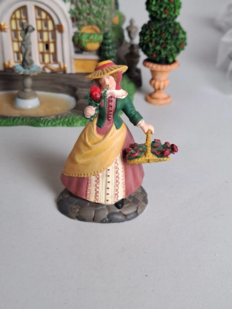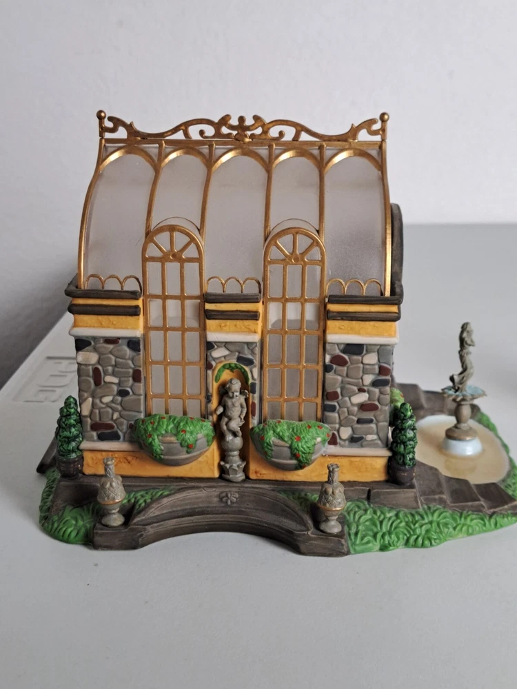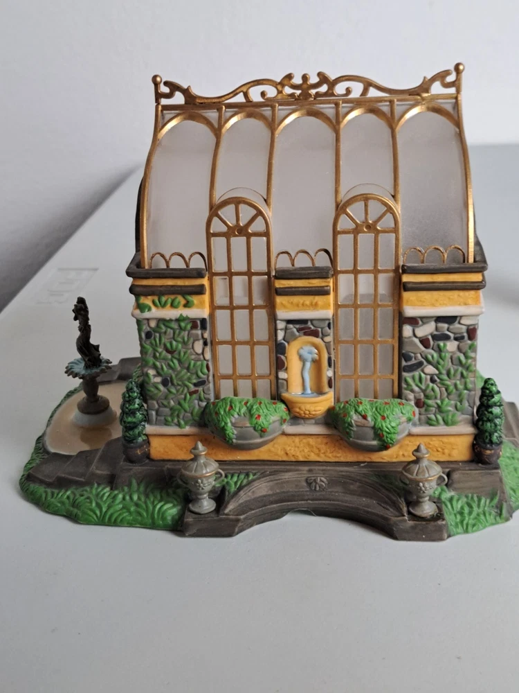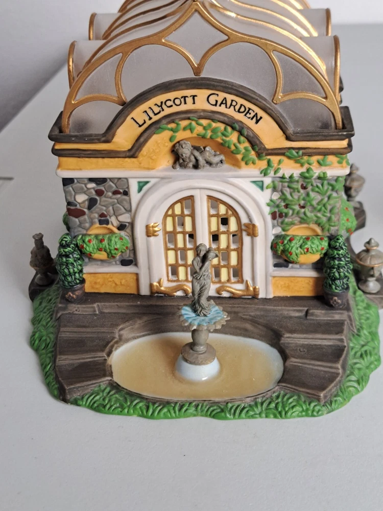 Dept. 56 Dickens Village Series Set LILYCOTT GARDEN CONSERVATORY is in Nice Pre-Owned Complete Condition. 2 Urn Pots On Building Side Have Been Reglued. Brand New Cord w/ Light Bulb. Box Flap Has Tear On Back Side and Taped. VERY PRETTY PIECE!!