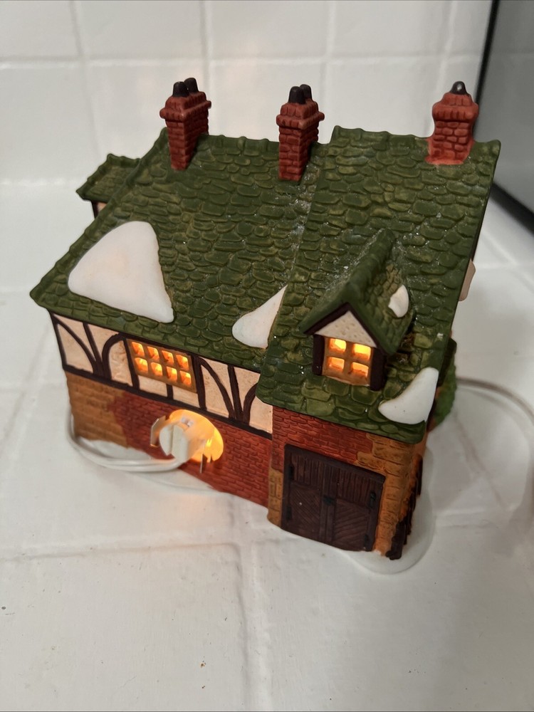 The Department 56 Dickens Village Nicholas Nickleby Cottage is a multicolored porcelain Christmas village piece from 1988. Part of the Dickens Village collection, this original and retired cottage features a quaint design inspired by the classic tale of Nicholas Nickleby. It does not come in its original box and was retired in 1991, adding to its collectible value for adults who enjoy creating holiday village displays.