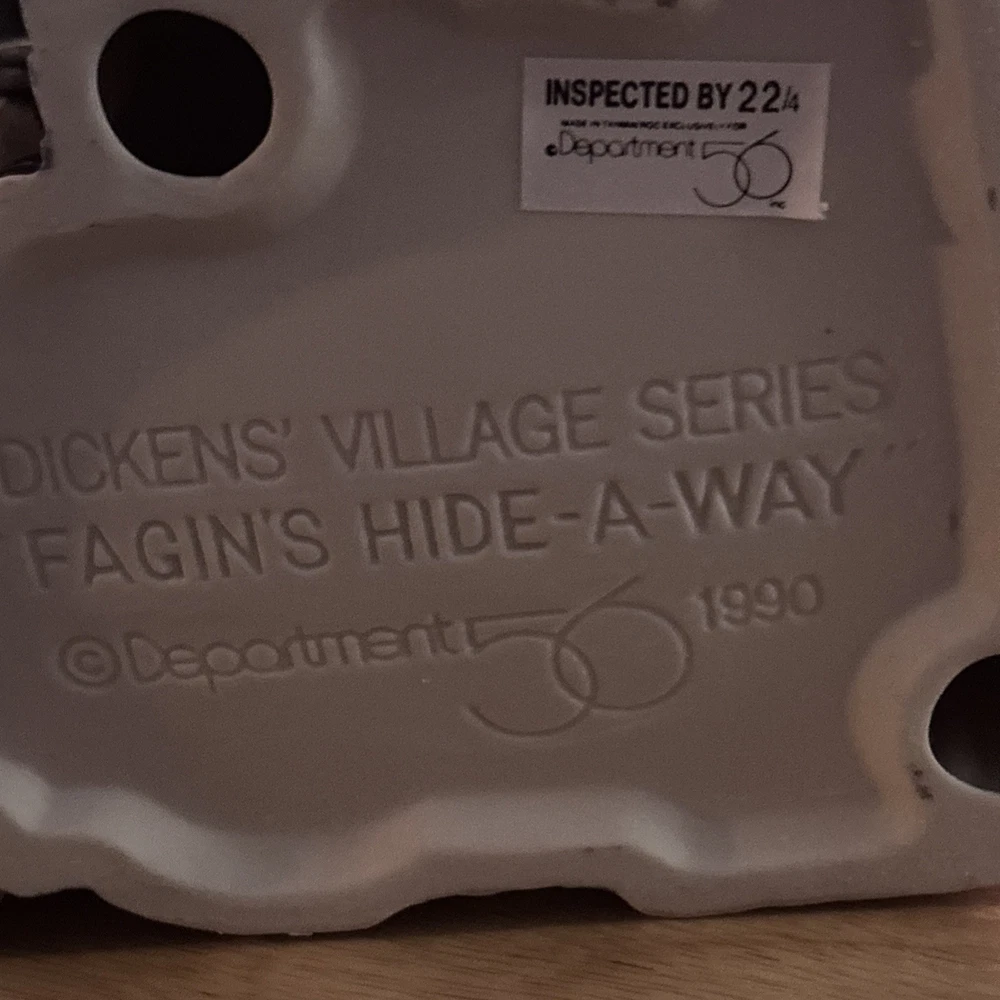 The product is a vintage Department 56 Dickens Village Series house from 1990, titled "Oliver Twist 'Fagin's Hideaway'. This asymmetrical, Victorian-style ceramic and porcelain building is hand-painted and illuminated, perfect for Christmas decor. The medium-sized piece features intricate details and a textured matte finish, making it suitable for display on a window, floor, or furniture in any room. Packaged in a box, this collectible item is a part of the Dickens Village collection, adding a touch of nostalgia and seasonal charm to any holiday display.