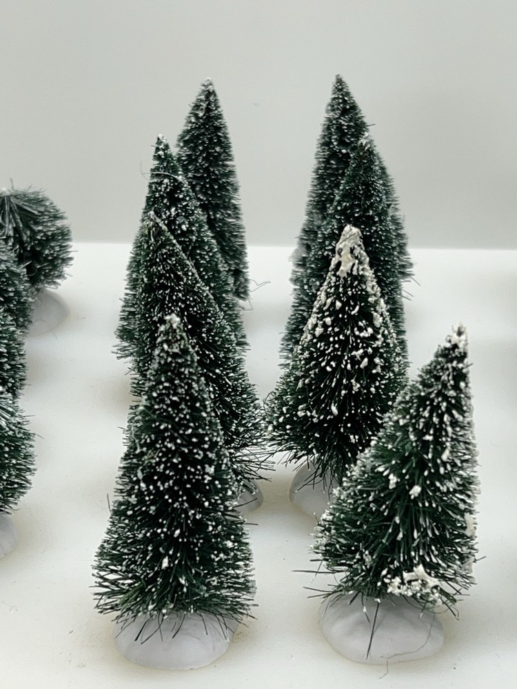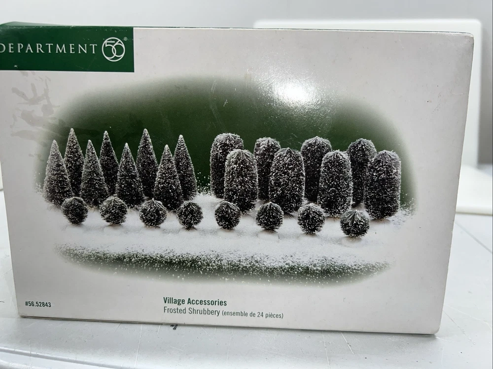 This Department 56 "Frosted Shrubbery" set of 24 village accessories is suitable for Christmas village displays. The small asymmetrical evergreen shrubs feature a frosted finish and are made of mixed materials. Manufactured in 1999, they are part of the seasonal Village Accessories collection, perfect for late 20th-century village scenes. Perfect pristine condition
