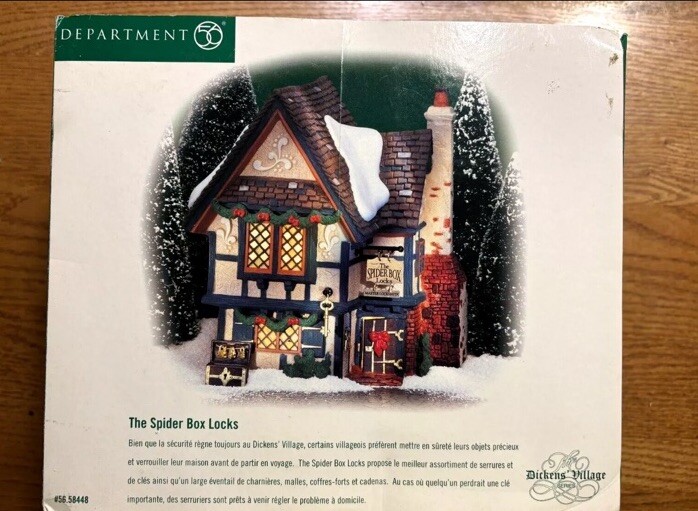 Add a touch of Victorian charm to your Christmas decor with this exquisite piece from the Department 56 Dickens Village collection. The Spider Box Locks set is a highly detailed ceramic and porcelain model that depicts a scene from "A Christmas Carol" with intricate hand-painted matte finishes. This illuminated set comes with a box and light, and is a retired piece that is perfect for any room in your home. With its rectangular shape, this small-sized set measures 4 3/4" deep, 6 3/4" tall, and 6 1/4" wide, and weighs 2 lbs. It is suitable for window, floor, interior, stairs, furniture, and figures visible inside. This original set is an excellent addition to any Dickens Christmas village collection and is a great way to celebrate the holiday season.