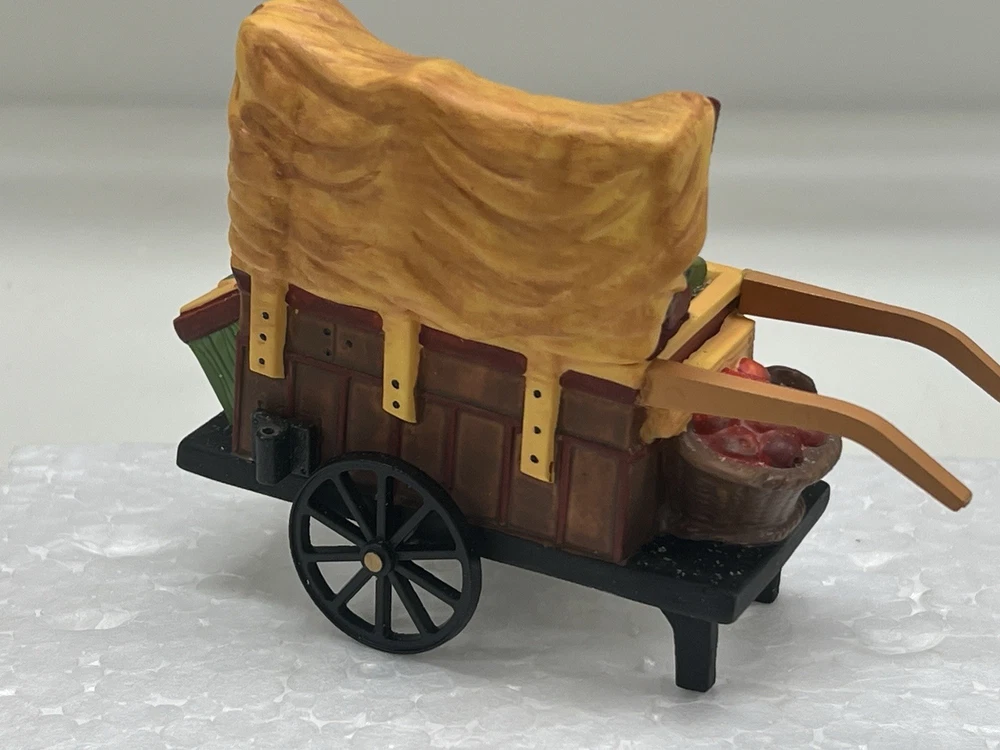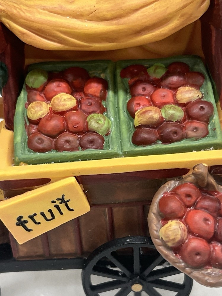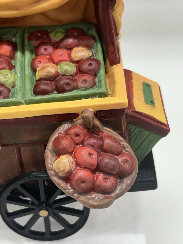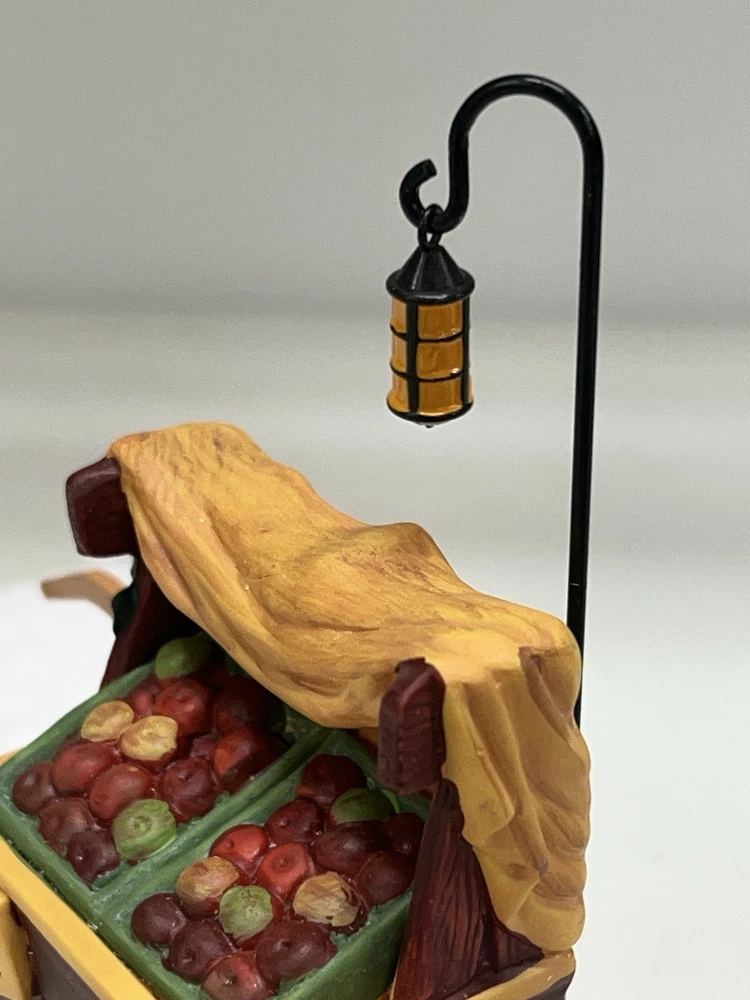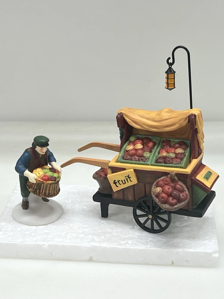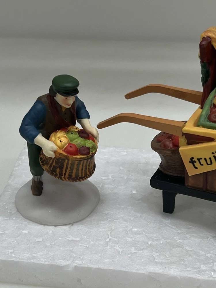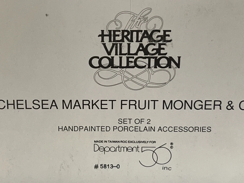 The Dept 56 Heritage Village Collection Chelsea Market Fruit Monger & Cart Set of 2 is a beautifully hand-painted porcelain figurine set from the Dickens Village collection. Featuring a charming fruit market scene, this retired piece is perfect for all occasions and comes boxed for easy display. The intricate painting and attention to detail make this a delightful addition to any holiday or seasonal village display. Ideal for collectors or anyone looking to add a touch of nostalgia to their home decor.