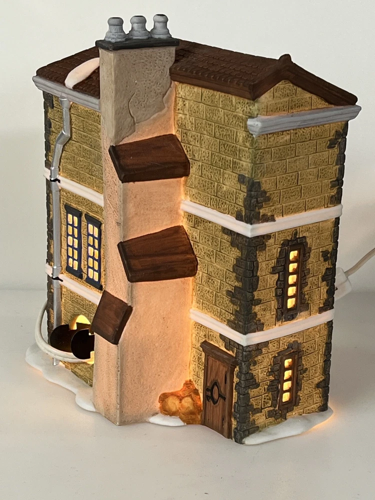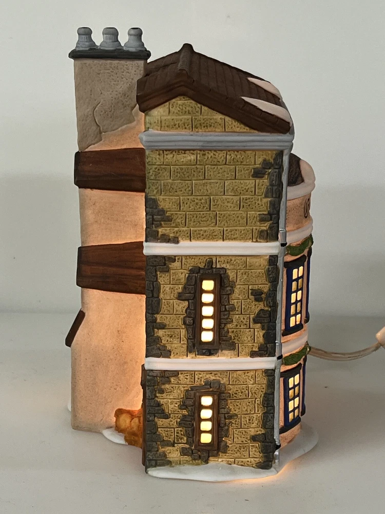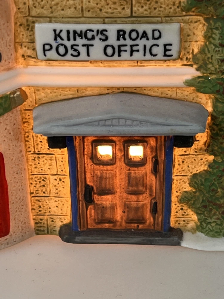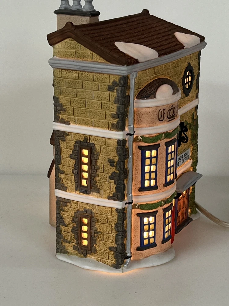 This is a Department 56 Kings Road Post Office from the Dickens Village series. It is a medium-sized, asymmetrical ceramic and porcelain Christmas village house that is hand-painted and illuminated. The house is part of the traditional Dickens Village collection and features a whimsical design. It measures 6 inches in length, 8 inches in height, and 4 inches in width. The item is suitable for seasonal display and is a retired piece from 1992. No original box, comes with cord & light