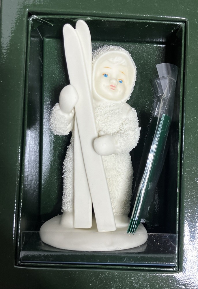The "Let's Go Skiing" Snowbabie figurine by Department 56 is a charming addition to any winter-themed collection. This porcelain figurine features a white snowbaby with a pair of skis Please feel free to contact me with any questions you have