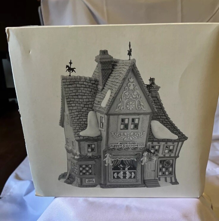 A horse broke off the top of building! This Department 56 porcelain house from the Dickens' Village collection features Nettie Quinn Puppets Marionettes. The asymmetrical, colonial-style house is finished with a matte multicolor paint and is boxed for storage. It was manufactured in 1996 and is an original piece, perfect for adding to a Christmas village display.