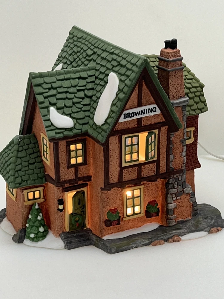 Dept 56 "Browning Cottage" from the Heritage Village Collection is a medium-sized, asymmetrical Victorian style illuminated house suitable for a Christmas village display. Manufactured in 1994, this retired piece features a whimsical design with a painted finish. The cottage is part of the Dickens Village collection and represents a seasonal theme in a brown color scheme. It is made of ceramic & porcelain and comes boxed with dimensions of 7" length, 6" height, and 5" width. Pristine condition with all original packaging including cord & light