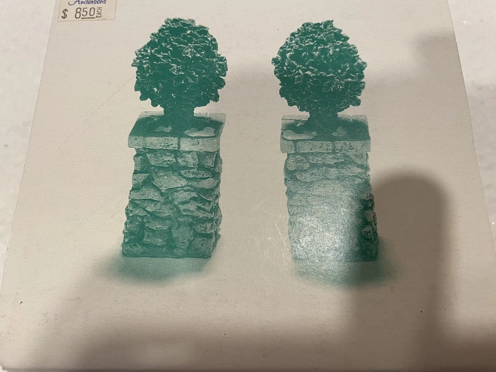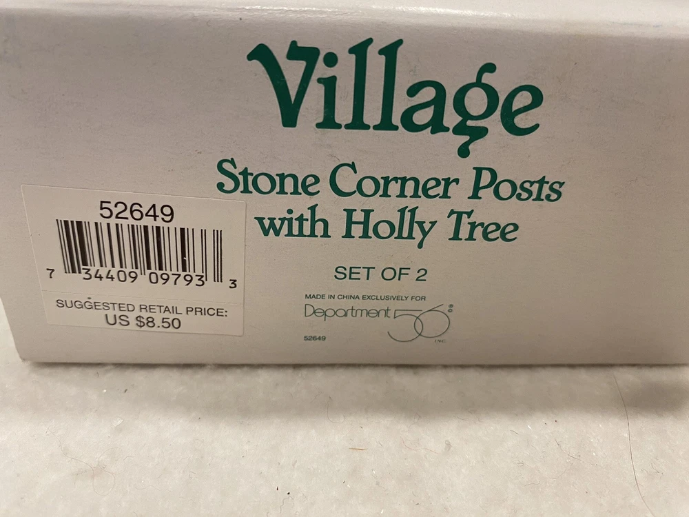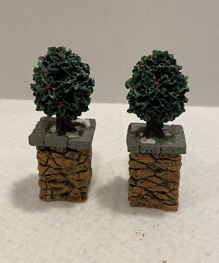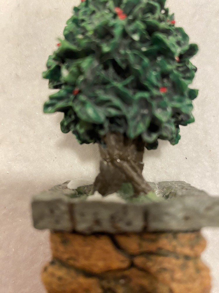 One tree trunk has been repaired, please see picture. Dept 56 Village Accessory STONE CORNER Posts with Holly Tree 52649 Retired. Includes box. Bin C