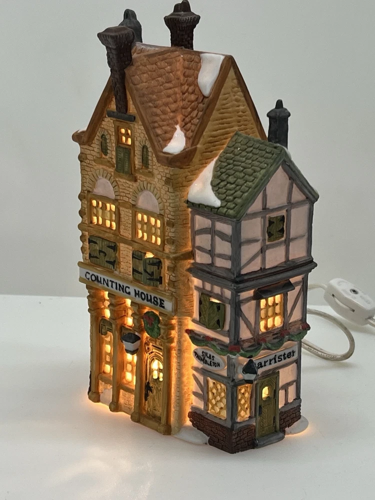 Add a touch of Victorian charm to your Christmas decor with this exquisite Dept 56 Heritage Village Collection piece. This hand-painted porcelain figurine features Silas Thimbleton Barrister, a beloved character from the Dickens Village series. The asymmetrical piece measures 4-1/2" in length, 8" in height, and 4" in width, making it a medium-sized addition to your collection. This retired, illuminated figurine is boxed and in excellent condition, ready to be displayed in any room of your home. Its whimsical pattern and multicolor finish make it a delightful addition to any Christmas village collection. Celebrate the season with this unique, original piece from the late 20th century, manufactured in Taiwan. Pristine condition with all original packaging including cord & light
