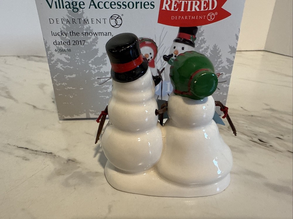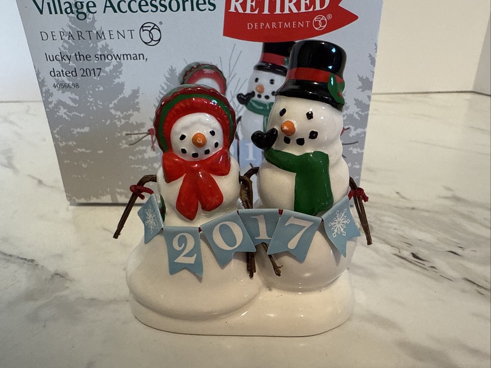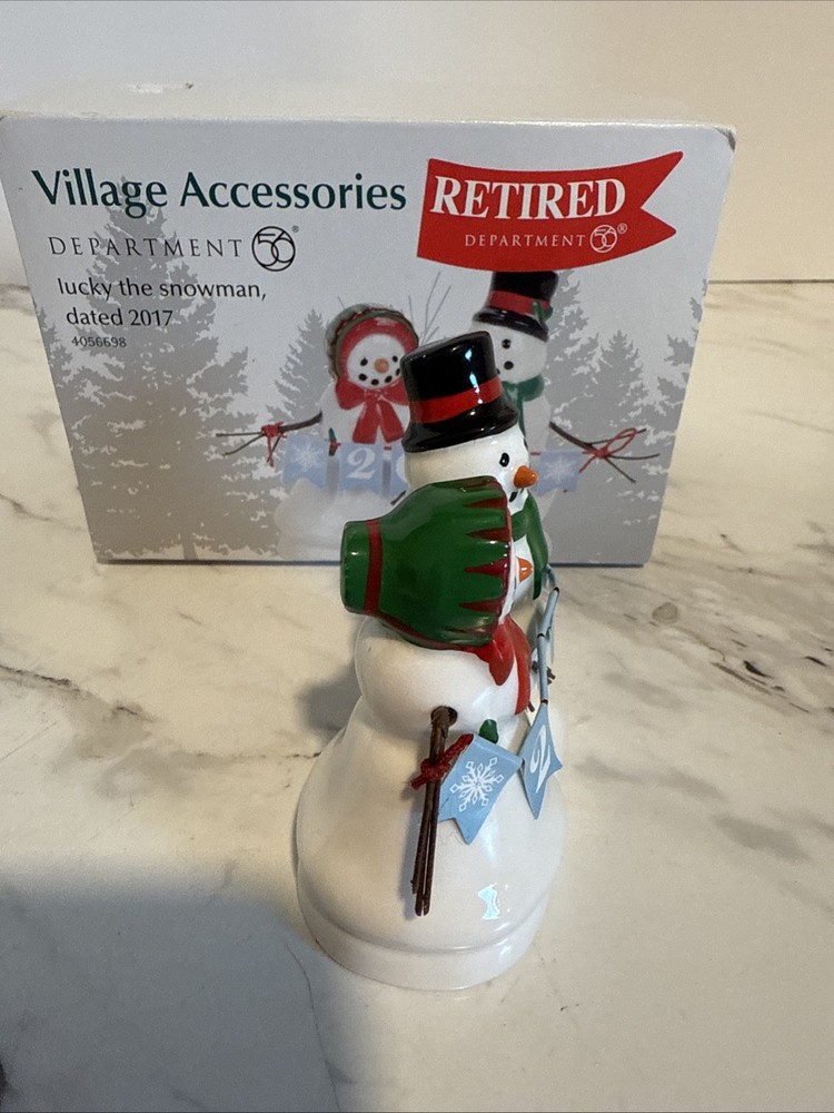 Dept 56 Snow Village Series Lucky The Snowman Dated 2017 Accessory Retired w/Box Pre-Owned in very good condition. See all photos. The box sleeve has a small dent on top. Thank you for looking and supporting my small business!