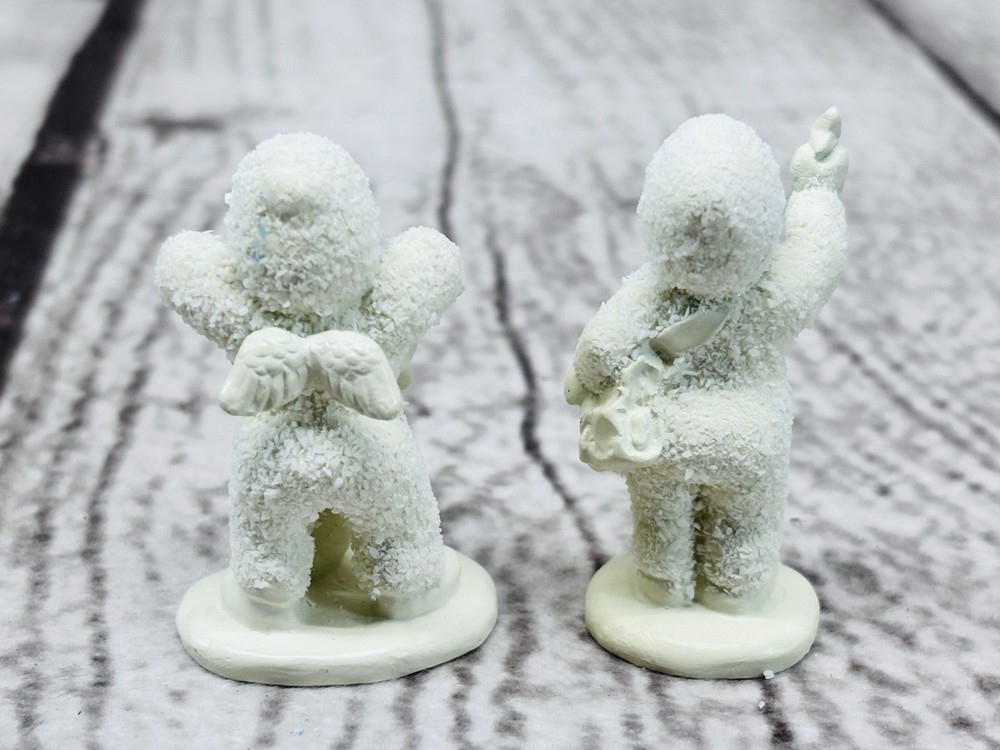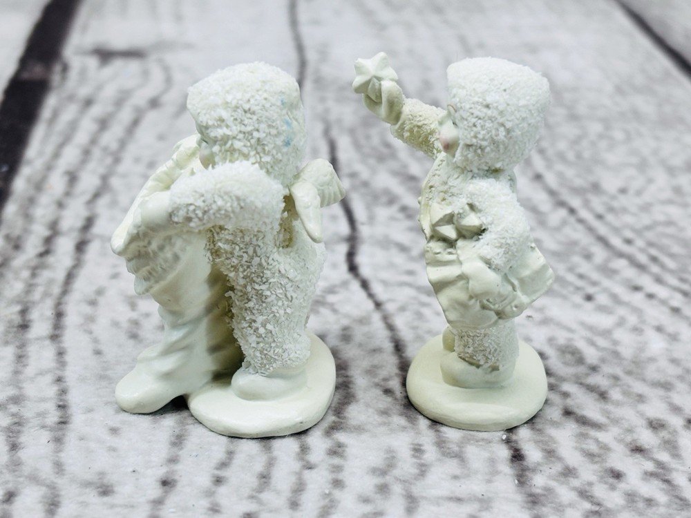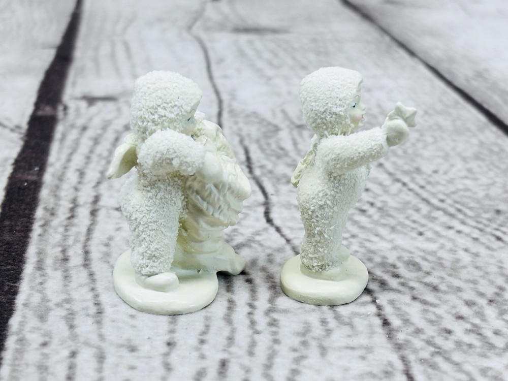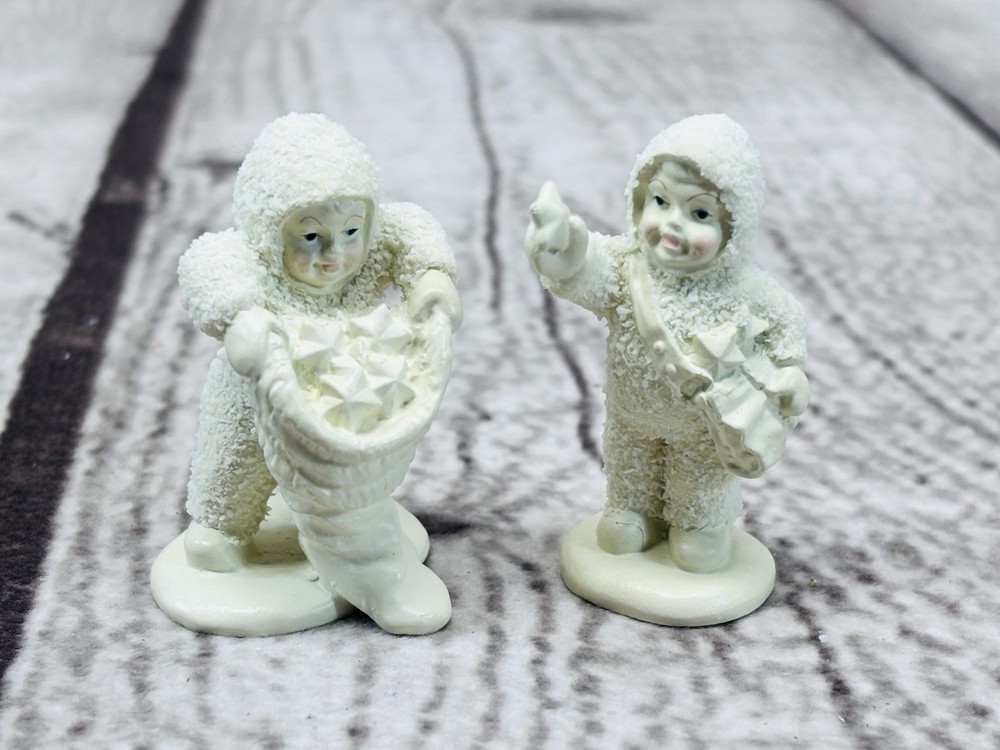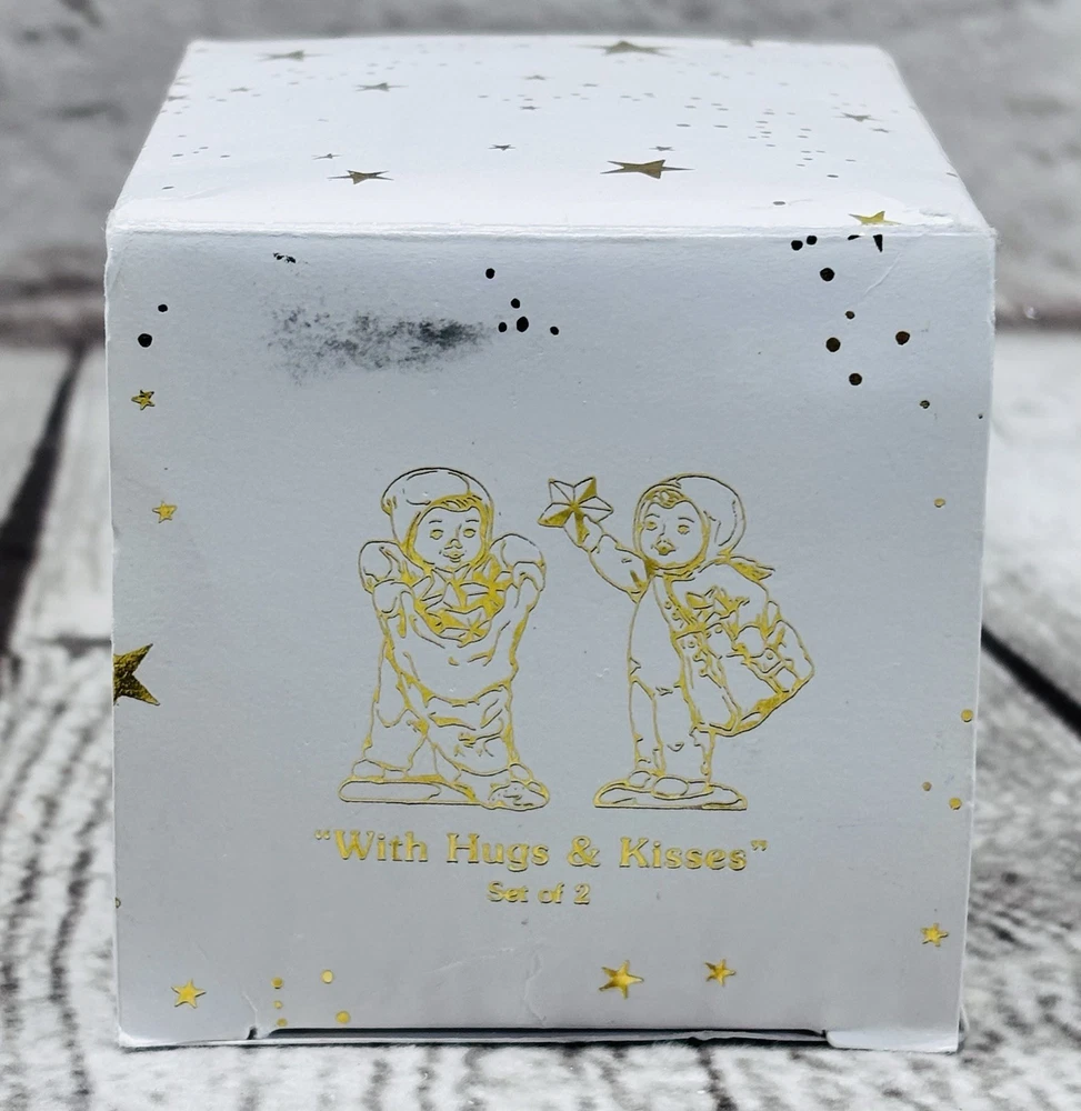 Dept 56 Snowbabies Miniatures With Hugs & Kisses Pewter Figurines Set of 2 Charming Department 56 Snowbabies Miniatures set titled “With Hugs & Kisses”. Includes two hand-painted pewter figurines, each measuring approximately 1.5” tall, featuring Snowbabies holding stars. •Title: “With Hugs & Kisses” Miniatures Set of 2 •Material: Hand-painted pewter •Measurements: Each approx. 1.5” tall •Condition: Mint figurines, appear never displayed •Packaging: Includes original box and styrofoam insert (box shows storage wear) •Markings: Department 56 stamp and sticker on base Delightful collectible Snowbabies miniatures, perfect for display or gifting. Ships securely with care.