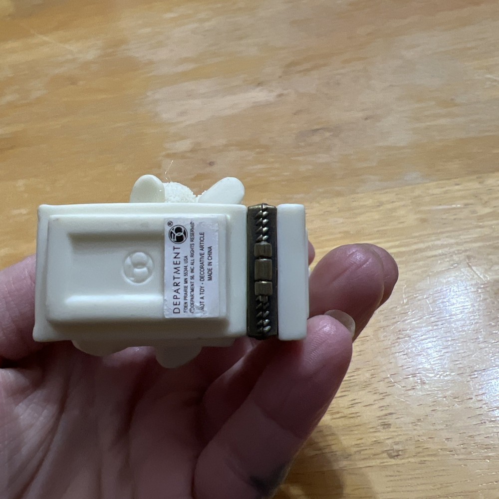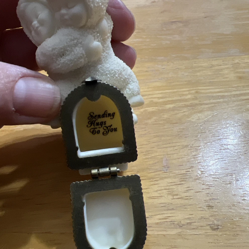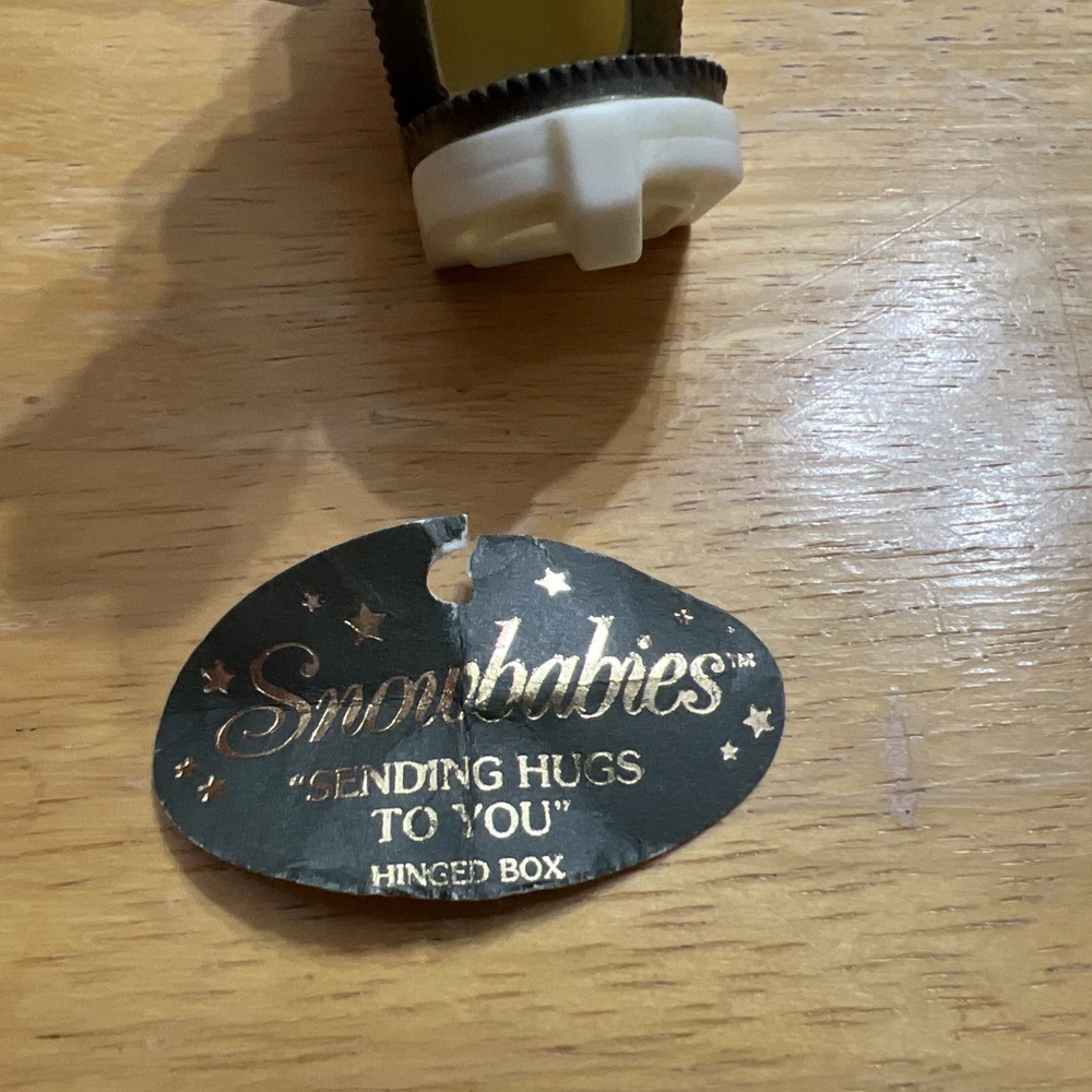 This product is a Department 56 Snowbabies trinket box called "Sending Hugs to You" with a hinged lid. It features an angel character and a boxing subject, with a white matte finish made of porcelain bisque. The figurine was manufactured in 1999 and is part of the Snowbabies collection. It is an original piece and has been retired. The trinket box would make a great addition to any Christmas or seasonal collection.