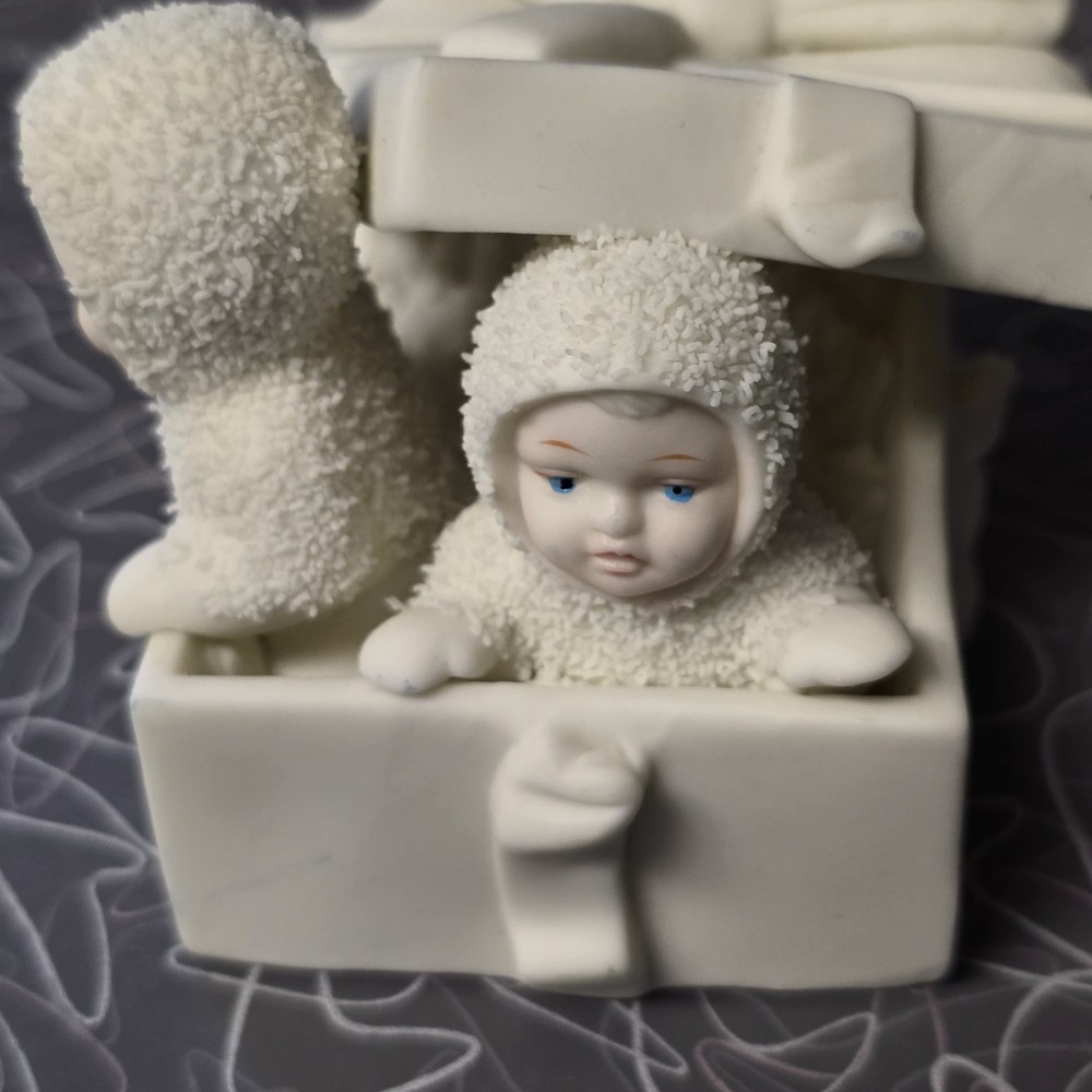 This Dept. 56 Snowbabies figurine features two adorable babies in a gift box, perfect for Christmas. The matte finish porcelain figurine was manufactured in Taiwan in 1987 and is a part of the Snowbabies collection. It is a small-sized, unboxed, and retired piece that makes a great addition to any holiday or figurine collection. The bone ivory color and 1980s style make it a timeless piece that can be enjoyed for years to come.