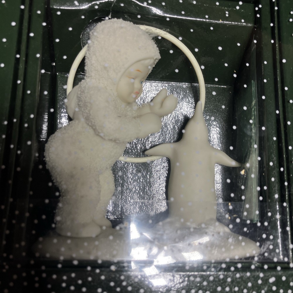 This Snowbabies Dept 56 Winter Tales I'll Teach You a Trick figurine is a charming piece featuring a contemporary style with an asymmetrical shape, perfect for the winter season. Made of porcelain and measuring 4 inches in height, this medium-sized figurine depicts a snowbaby and penguin characters in a playful scene. Produced in 1996 as part of the Snowbabies collection from Department 56, this original piece comes boxed and showcases a matte finish, embodying the enchanting world of winter tales. Please feel free to contact me with any questions you have