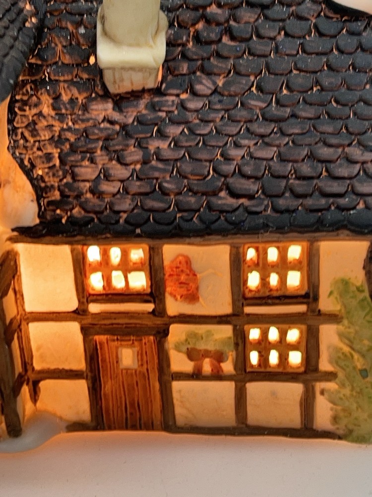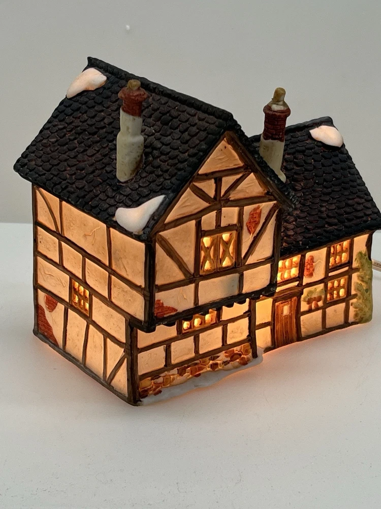 This beautiful porcelain cottage from the Department 56 Heritage Village Collection is a must-have for any collector of Christmas village houses. The Tudor Cottage, also known as the Dickens Village, features intricate hand-painted details and is illuminated for a cozy and charming display. The cottage is medium-sized, measuring 6 inches in length, 6 inches in height, and 4 inches in width, and is suitable for any room in your home. The cottage is a retired piece from 1985 and comes in its original box with the slip sleeve and styrofoam container. It is perfect for seasonal village displays and would make a great addition to any Dickens Village collection. The cottage is multi-colored and depicts a whimsical scene from Charles Dickens' Victorian era. This collectible item is a great gift for any lover of Christmas and Dickensian culture. Perfect condition with all original packaging including light & cord