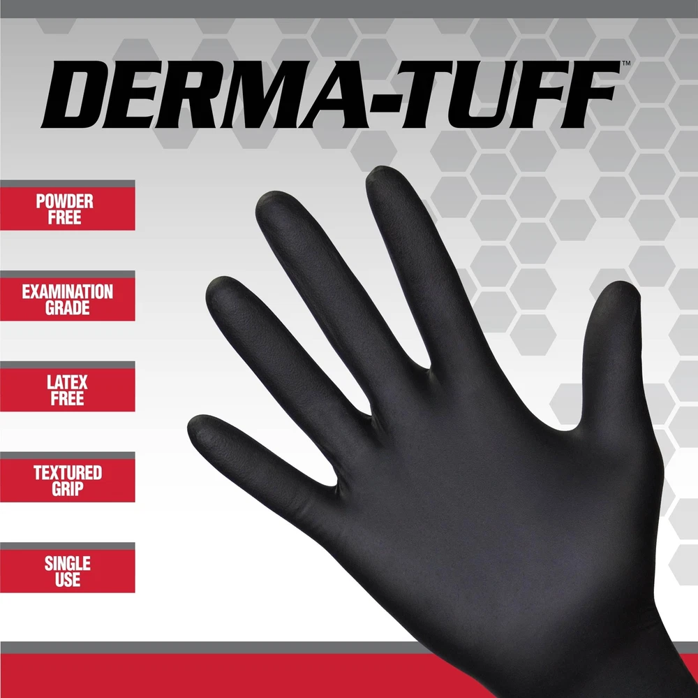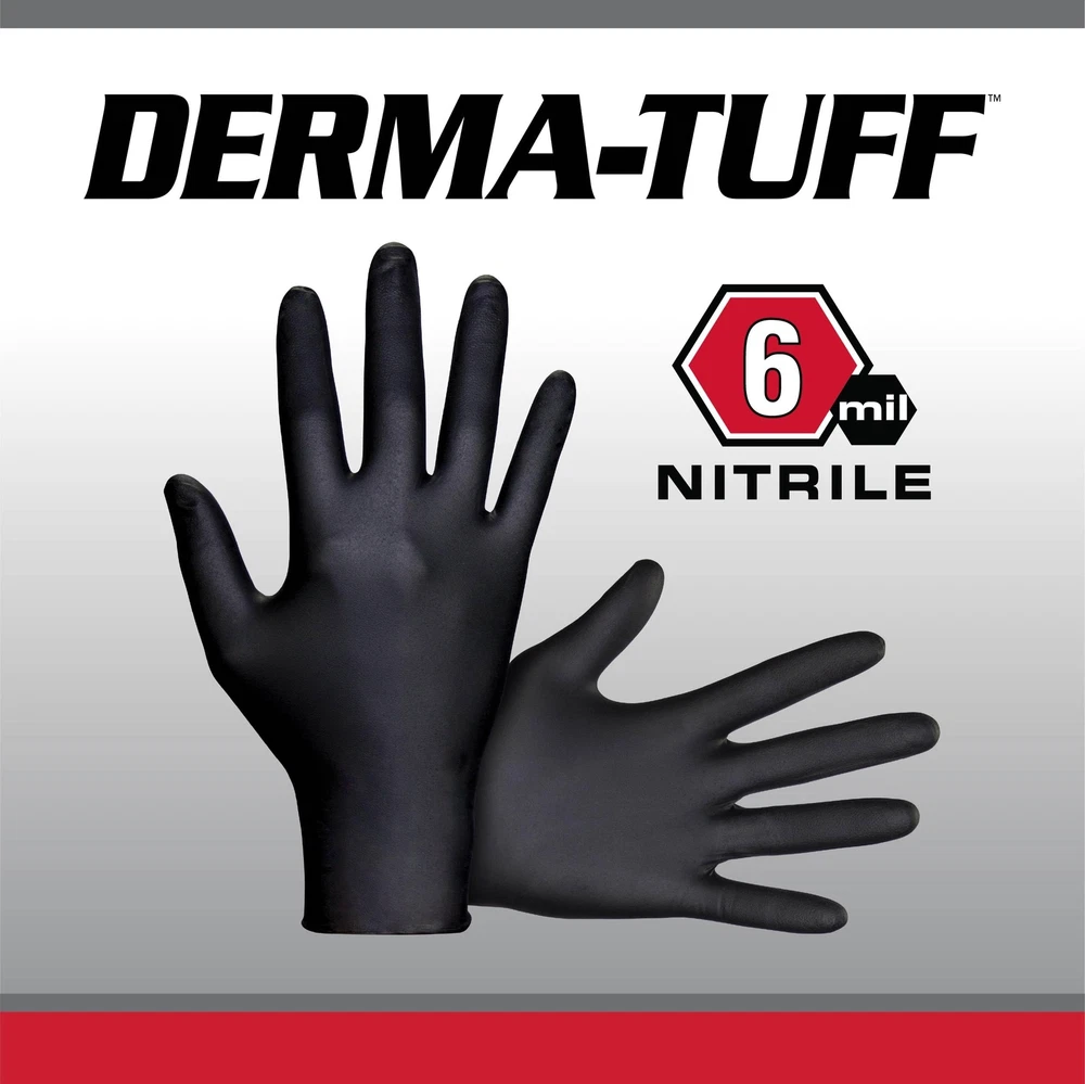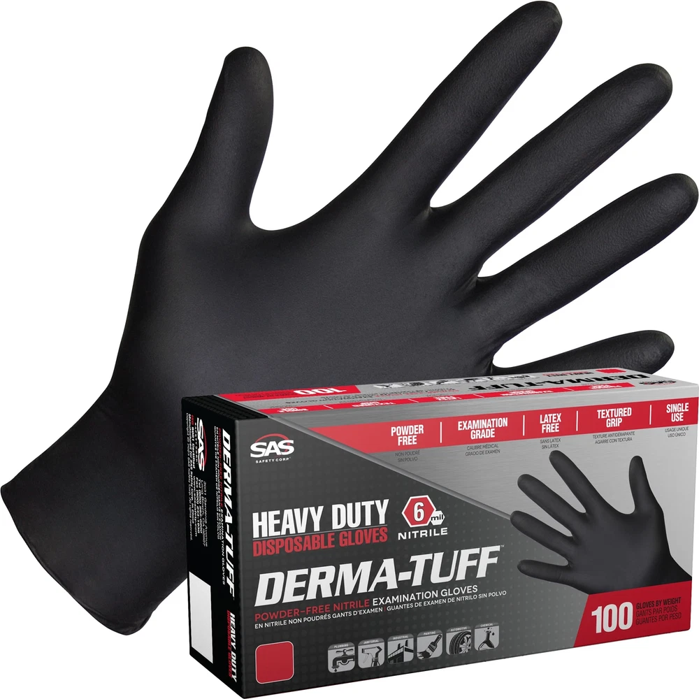 Derma-Tuff Powder-Free Disposable Nitrile Gloves Delivers superior protection for everyday tasks Designed for comfort and flexibility, our heavy duty Derma-Tuff nitrile gloves provide a snug fit, ensuring optimal dexterity without compromising on durability. With a non-allergenic and latex-free design, they cater to a wide range of users, making them the perfect general purpose gloves. Usage: Single Use Available Sizes: S, M, L, XL, 2XL Thickness: 6 mil Material: Nitrile Color: Black Grip: Textured Length: 9.5" HEAVY DUTY NITRILE DISPOSABLE GLOVES: The Derma-Tuff 6 Mil Powder-Free Heavy Duty Nitrile Gloves outperform the competition with their outstanding strength, puncture and chemical resistance, and dexterity. Perfect for everyday use—including automotive, work shops, agriculture, and plumbing—these no-latex nitrile gloves will help get you through your task. POWDER-FREE, LATEX-FREE: Perfect for cleaning, food service, and many kinds of MRO, the Derma-Tuff Disposable Gloves are made of latex-free, allergenic, powder-free nitrile which is known to be 3x-5x more puncture resistant than latex and strong enough to even protect from blood-born pathogens—making nitrile the preferred exam glove choice in the healthcare industry as well. BUILT FOR TOUGH JOBS: The Derma-Tuff Powder-Free Black Nitrile Gloves are 6 mils thick for outstanding hand protection. Featuring a beaded cuff for easy donning, the Derma-Tuff is fully textured for enhanced gripping power to confidently last through even the toughest jobs—from maintenance, industrial, and janitorial to automotive, refinishing, and machining. SANITARY AND HYGIENIC: prioritizes safety above all else, and we designed the Derma-Tuff Series with hygiene in mind. Crafted with optimal proprietary materials, these go-to single-use, disposable, ambidextrous nitrile gloves are available in an economic box of 100 count for ultimate worry-free sanitation. WHEN PROTECTION COUNTS: At Safety Corp., we dedicate ourselves to protect our most valuable resource: people. Our expansive product line of powder-free gloves in nitrile, chloroprene, and latex offers exceptional protection for professionals, multi-markets, and the DIYer across the spectrum of environments and industries.