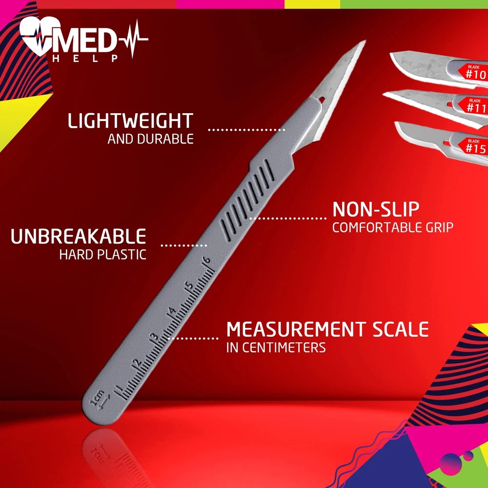 Dermaplaning Kit Professional - Dermaplane Blades for Esthetician, Disposable Surgical Scalpel Blades #10, #11, #15, Scalpel Handle 3, Scalpel Blade Remover Product Details Size: #10, #11, #15 Red Color: Pack of 10 Brand: MedHelp MPN: B79-MH41-DCK UPC: 742488180408 EAN: 0742488180408 Product Dimensions : 8 x 2.49 x 1.59 inches; 4.66 ounces Date First Available : September 1, 2022 Manufacturer : MedHelp PREMIUM DERMAPLANING CLEANING KIT - All the tools you need for a successful and professional dermaplaning session in one kit. The scalpel knife and blade remover allow for precise, easy and safe use of the disposable scalpel blades. INDIVIDUALLY WRAPPED & STERILE BLADES - Each scalpel blade is individually wrapped to ensure sterility and prevent accidental punctures. The sterilization by gamma radiation guarantees sterility as long as the foil is not broken. VARIETY OF BLADES INCLUDED - The kit includes sterilized carbon steel scalpel blades #10 Round (for dermaplaning) #11 and #15, sterilized carbon steel blades (for extractions), and mini scapels. BLADE REMOVER & CARRYING POUCH - The kit also includes a blade remover for safe removal of blades from the metal scalpel handle and a carrying pouch for easy storage and transportation of the tools. MULTIPURPOSE USE - The scalpel knife and blades in this kit can be used for a variety of purposes beyond dermaplaning, such as in arts and crafts, trimming, medical procedures, cyst removal, dissection, and more. Are you tired of buying all those scalpels and throw them away because they are no good?SEARCH NO MORE...Box of 20, sterile, high-end disposable scalpels 11 with Ultra Sharp Carbon-Steel blades Beautiful cosmetic tool for small aesthetic procedures or any DIY projects, scalpel dermatology, pimple acne blade medical, sergical cyst scalpel cloning obsidian lancing free dermaplanning blades sculpting or bread lame set Designed sturdy, durable, safe and easy to use. Each of our disposable scalpels has a Carbon-Steel blade, which allows every one to use it for all kind of cuts; they are even REUSABLE, thanks to the protective cap they come with. Combined with the plastic handle that makes for an easy grip, you can enjoy precision control in every move. 11 Scalpels That are Perfect For: ✅ Facial Dermaplanning / Easy surgical procedures ✅ Podiatry ✅ Pedicure ✅ Dead skin/Calluses ✅ Pimple/ Blackhead removal ✅ Arts and Crafts ✅ Clay Modeling ✅ Carving/ Wood Carving ✅ Dissecting ✅ Fabric / vinyl / plastic cut MedHelp means Quality ! We hold the highest possible standards when it comes to our products, and our disposable scalpels are no exception to that rule. We are more than happy to share with you that passion for quality, in unbeatable prices. So Click “Add To Cart” Today & Grab Your Own Pack of 10 11 MedHelp Disposable Scalpels!LOOKS MATTER. A LOT. REMEMBER THIS: If you will use it once, you will want to use it always!