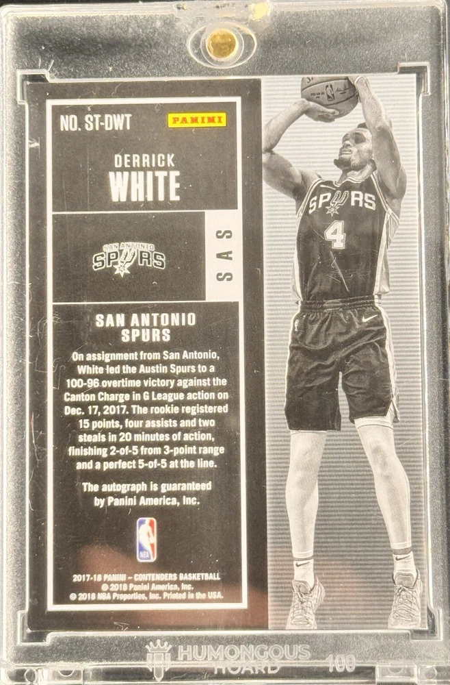 Derrick White 2017-18 Panini Contenders Rookie Ticket Auto trading card featuring an autograph of the player. The card is from the National Basketball Association (NBA) season, manufactured in 2018. It is a Rookie card with the card number ST-DWT, belonging to the San Antonio Spurs or Boston Celtics teams. CARD SHIPS IN MAG.