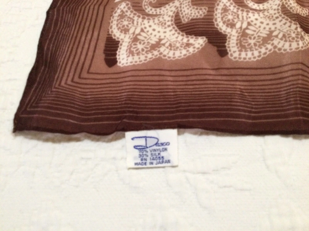 Desco Vintage Brown Paisley Square silk blend Scarf 23.5"x23.5" (K46) Gently preowned Item Details: Shipping, payment, & other information: • Items come from a pet free and smoke free home. • I ship within 2 business days of receiving payment. • If you have questions about an item please ask those BEFORE bidding or purchasing. • In an effort to be green, we do recycle shipping materials. • All REASONABLE offers will be considered! Please checkout our store and our other items - we have unique finds dropping monthly at discounted prices! **I DO COMBINE SHIP ITEMS. PLEASE LET ME KNOW AND I WILL SEND YOU AN UPDATED INVOICE. **