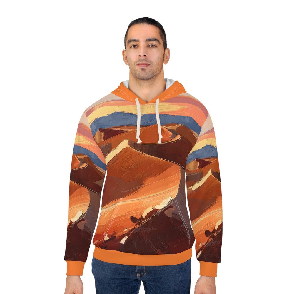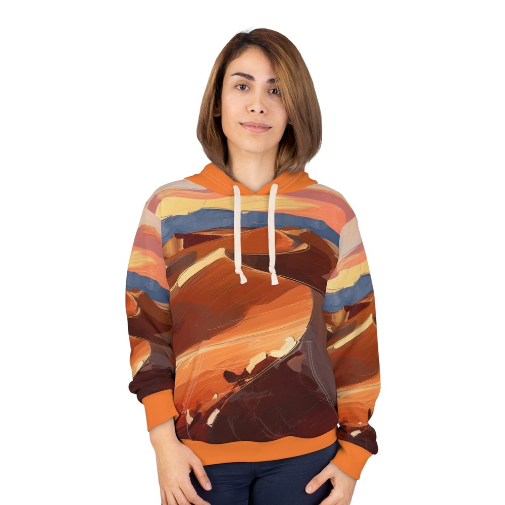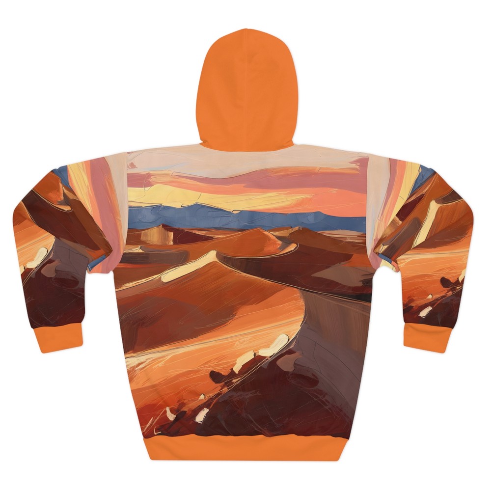 Ignite your adventures with our All-Over Print Hoodie, featuring the vibrant Firelight Embrace design inspired by the beauty of national parks. This unisex pullover is perfect for outdoor travel, keeping you cozy and stylish. Embrace nature’s warmth and explore in comfort, wherever the journey takes you. - Made of 100% durable polyester - Medium weight fabric with a classic fit - Tumble dry: low heat - Machine wash: cold (max 30C or 90F) XS S M L XL 2XL Length, in 25.00 26.61 27.64 29.25 30.24 31.89 Width, in 20.00 21.50 22.99 24.49 26.50 28.50 Sleeve Length, in 23.86 24.25 24.88 25.39 25.87 26.38