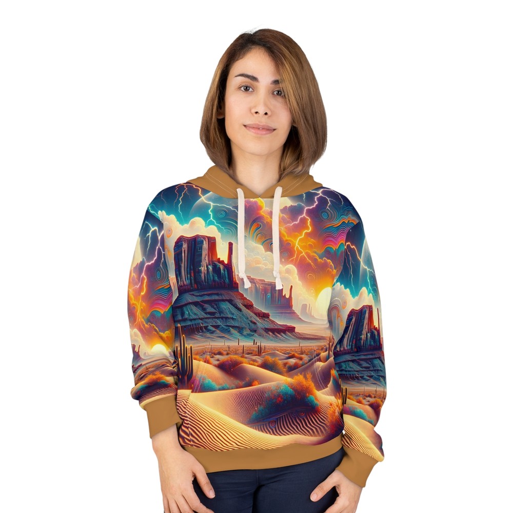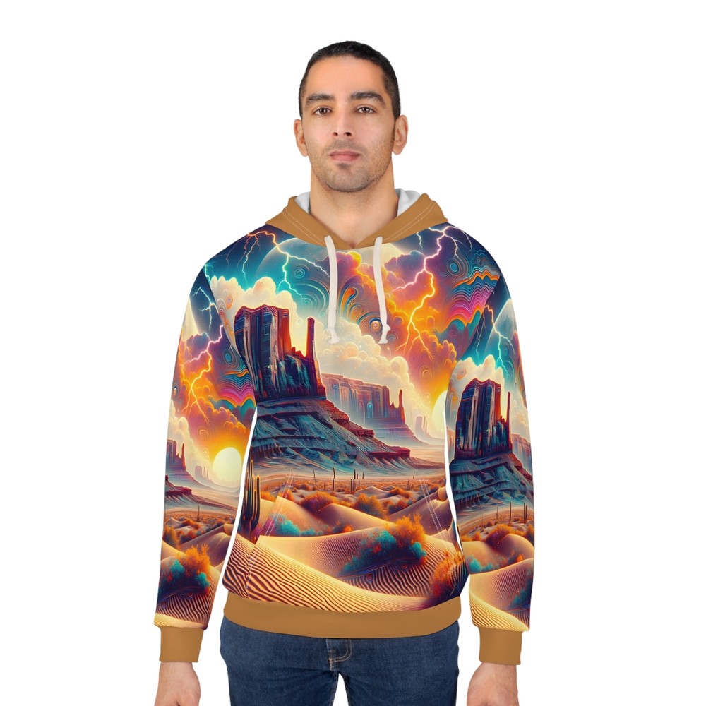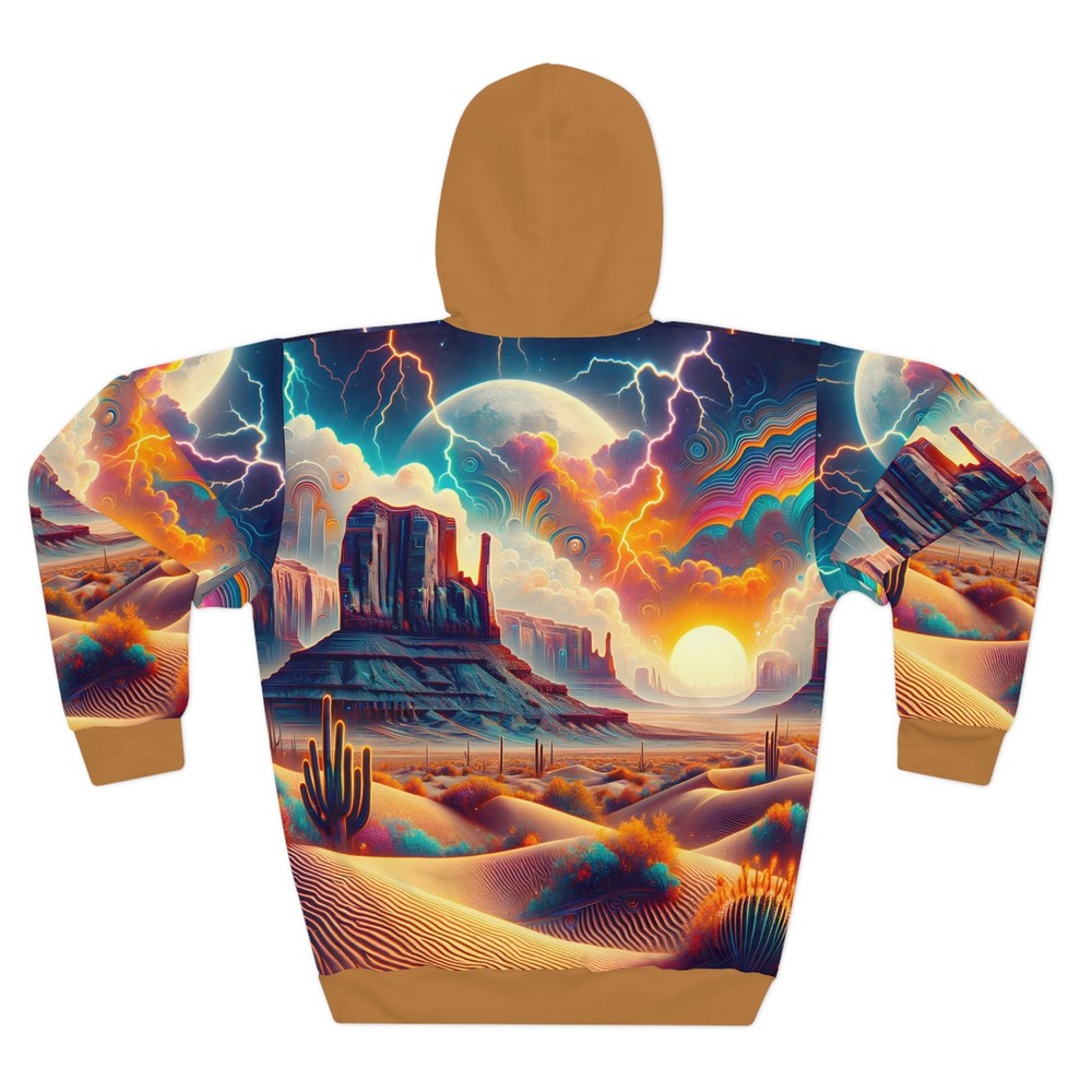 Embrace the desert vibes with our Desert-Inspired All-Over Print Hoodie, featuring a stunning psychedelic sunset design. This unisex pullover combines comfort and style, perfect for cozy evenings or adventurous days. Let the vibrant colors and unique patterns express your individuality. Stand out anywhere you go! - Made of 100% durable polyester - Medium weight fabric with a classic fit - Tumble dry: low heat - Machine wash: cold (max 30C or 90F) XS S M L XL 2XL Length, in 25.00 26.61 27.64 29.25 30.24 31.89 Width, in 20.00 21.50 22.99 24.49 26.50 28.50 Sleeve Length, in 23.86 24.25 24.88 25.39 25.87 26.38