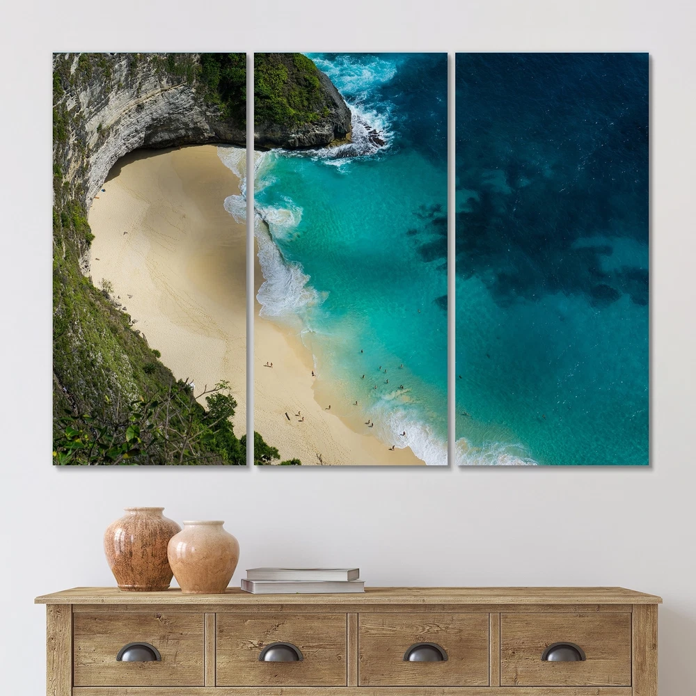 This beautiful Aerial View Of Blue Ocean Beach Multipanels canvas art is printed using the highest quality fade-resistant ink on canvas. Every one of our fine art giclee canvas prints is printed on premium quality cotton canvas, using the finest quality inks which will not fade over time. Each giclee print is stretched tightly over a 1-inch wood subframe ensuring the canvas is taught and does not buckle. This canvas art print is gallery-wrapped (the design continues on the sides), giving it a real art gallery feel. All of our canvas prints are carefully packaged with plastic protection, fragile labeling, and sturdy boxes to ensure safe delivery. Every canvas print arrives ready to hang on the wall, with the hanging kits included.- Style : Nautical & Coastal- Subject : Beach, Landscapes- Free Shipping Over $49.99* Details Designart "Aerial View Of Blue Ocean Beach" Nautical & Coastal Canvas Wall Art Product Description: This beautiful Aerial View Of Blue Ocean Beach Multipanels canvas art is printed using the highest quality fade-resistant ink on canvas. Every one of our fine art giclee canvas prints is printed on premium quality cotton canvas, using the finest quality inks which will not fade over time. Each giclee print is stretched tightly over a 1-inch wood subframe ensuring the canvas is taught and does not buckle. This canvas art print is gallery-wrapped (the design continues on the sides), giving it a real art gallery feel. All of our canvas prints are carefully packaged with plastic protection, fragile labeling, and sturdy boxes to ensure safe delivery. Every canvas print arrives ready to hang on the wall, with the hanging kits included. - Style Nautical & Coastal - Subject Beach, Landscapes - Color Turquoise - This canvas giclee print is gallery-wrapped (the design continues on the sides) , giving it a real art gallery feel. - Premium quality cotton canvas. - Arrives ready to hang on the wall - Easy to Hang