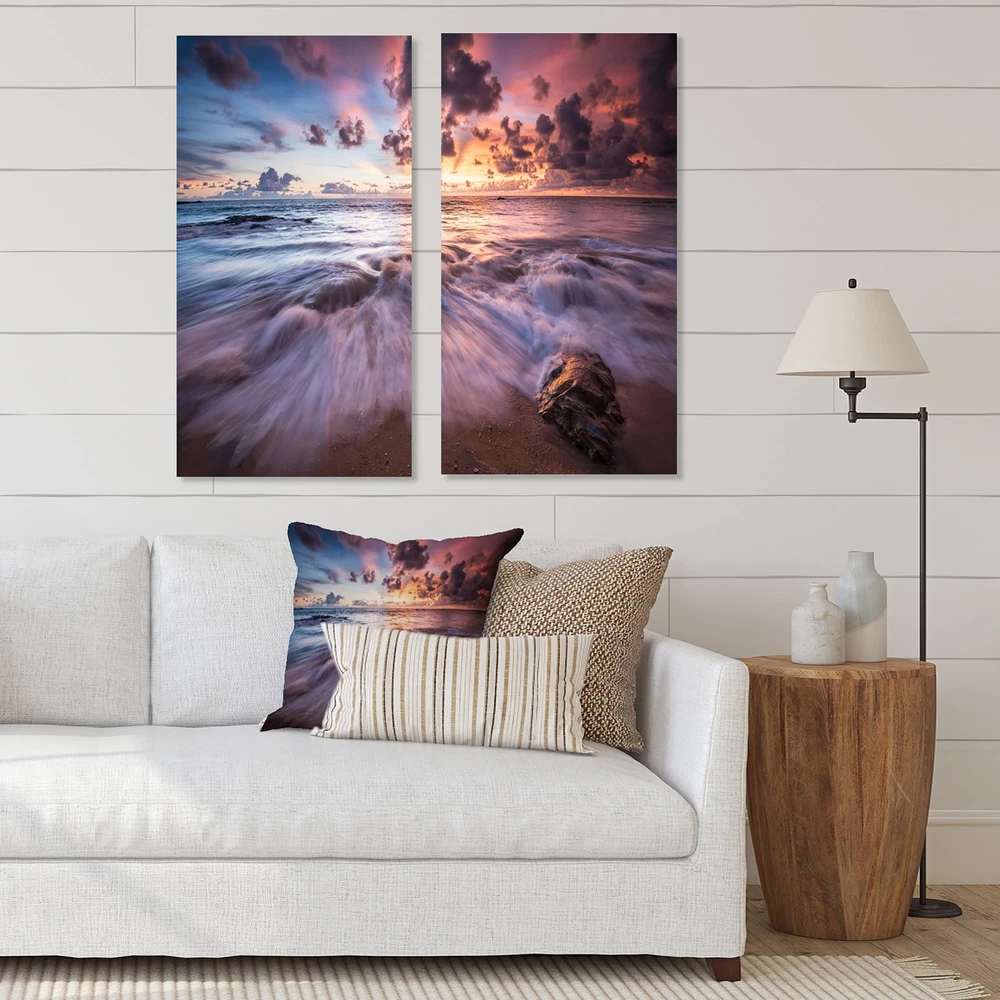 This beautiful Nautical & Coastal 2 piece set of Canvas Art is printed using the highest quality fade-resistant ink on canvas. Every one of our fine art giclee canvas prints is printed on premium quality cotton canvas, using the finest quality inks which will not fade over time. Each giclee print is stretched tightly over a 1-inch wood sub frame ensuring the canvas is taught and does not buckle. This canvas art print is gallery-wrapped (the design continues on the sides), giving it a real art gallery feel. All of our canvas prints are carefully packaged with plastic protection, fragile labeling, and sturdy boxes to ensure safe delivery. Every canvas print arrives ready to hang on the wall, with the hanging kits included.- Style : Nautical & Coastal- Subject : Beach, Landscapes- Color : Free Shipping Over $49.99* Details Designart "Beautiful Sea Waves At Sunset" Beach Canvas Wall Art Print 2 Piece Product Description: This beautiful Nautical & Coastal 2 piece set of Canvas Art is printed using the highest quality fade-resistant ink on canvas. Every one of our fine art giclee canvas prints is printed on premium quality cotton canvas, using the finest quality inks which will not fade over time. Each giclee print is stretched tightly over a 1-inch wood sub frame ensuring the canvas is taught and does not buckle. This canvas art print is gallery-wrapped (the design continues on the sides), giving it a real art gallery feel. All of our canvas prints are carefully packaged with plastic protection, fragile labeling, and sturdy boxes to ensure safe delivery. Every canvas print arrives ready to hang on the wall, with the hanging kits included. - Style Nautical & Coastal - Subject Beach, Landscapes - Color Purple - This canvas giclee print is gallery-wrapped (the design continues on the sides), giving it a real art gallery feel. - Premium quality cotton canvas. - Arrives ready to hang on the wall - Easy to Hang