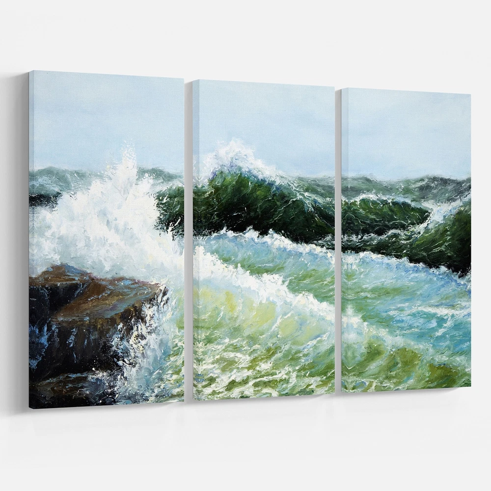This beautiful Sea & Shore Canvas Art is printed using the highest quality fade resistant ink on canvas. Every one of our fine art giclee canvas prints is printed on premium quality cotton canvas, using the finest quality inks which will not fade over time. Each giclee print is stretched tightly over a 1 inch wood sub frame ensuring the canvas is taught and does not buckle. This canvas art print is gallery-wrapped (the design continues on the sides) , giving it a real art gallery feel. All of our canvas prints are carefully packaged with plastic protection, fragile labeling and sturdy boxes to ensure a safe delivery. Every canvas print arrives ready to hang on the wall, with the hanging kits included.- Style : Nautical & Coastal- Subject : Sea & Shore, Nautical- Color : Blue- This canvas Free Shipping Over $49.99* Details Designart "Big waves during storm" Sea & Shore Print on Wrapped Canvas set - Product Description: This beautiful Sea & Shore Canvas Art is printed using the highest quality fade resistant ink on canvas. Every one of our fine art giclee canvas prints is printed on premium quality cotton canvas, using the finest quality inks which will not fade over time. Each giclee print is stretched tightly over a 1 inch wood sub frame ensuring the canvas is taught and does not buckle. This canvas art print is gallery-wrapped (the design continues on the sides) , giving it a real art gallery feel. All of our canvas prints are carefully packaged with plastic protection, fragile labeling and sturdy boxes to ensure a safe delivery. Every canvas print arrives ready to hang on the wall, with the hanging kits included. - Style Nautical & Coastal - Subject Sea & Shore, Nautical - Color Blue - This canvas giclee print is gallery-wrapped (the design continues on the sides) , giving it a real art gallery feel. - Premium quality cotton canvas. - Arrives ready to hang on the wall - Easy to Hang